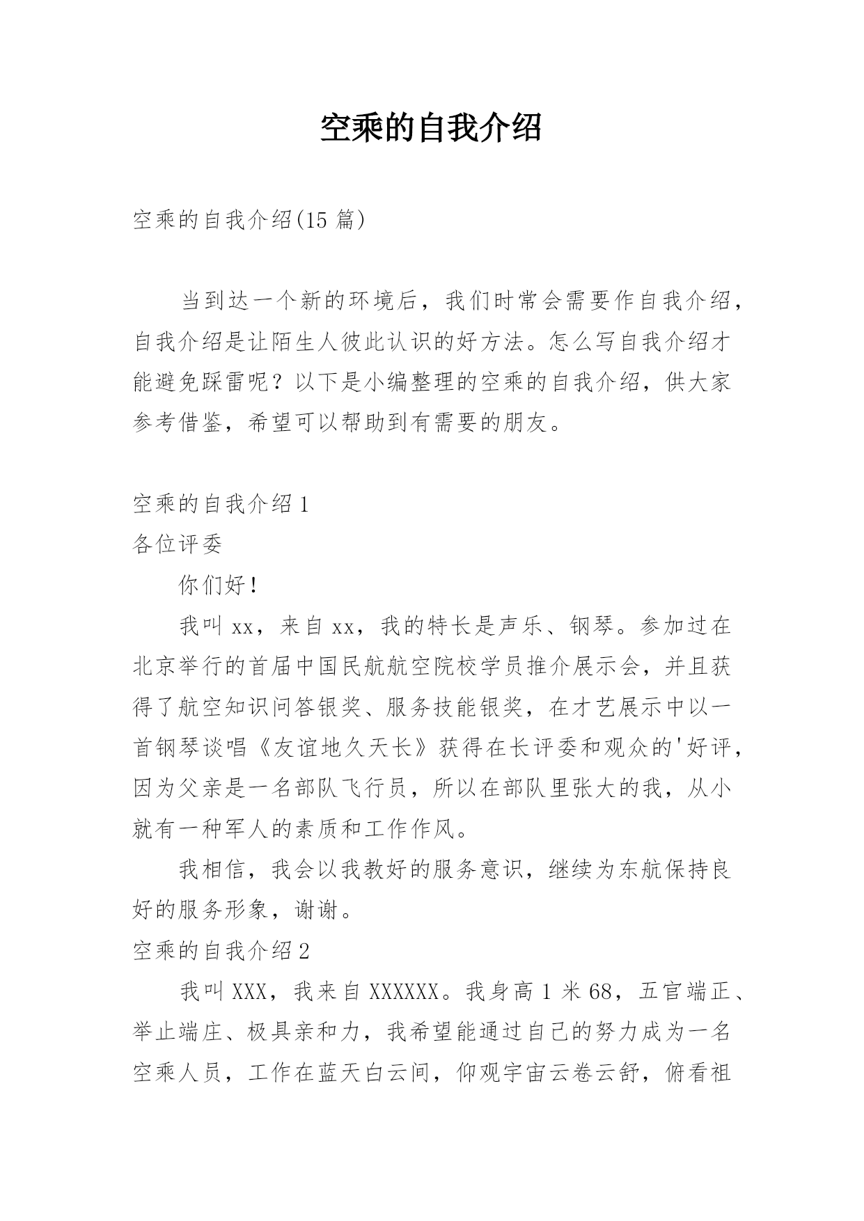 空乘的自我介绍空乘的自我介绍(15篇)当到达一个新的环境后,我们时常会需要作自我介绍,自我介绍是让陌生人彼此认识的好方法。怎么写自我介绍才能避免踩雷呢?以下是小编整理的空乘的自我介绍,供大家参考借鉴,希望可以帮助到有需要的朋友。空乘的自我介绍1各位评委你们好!我叫xx,来自xx,我的特长是声乐、钢琴。参加过在北京举行的首届中国民航航空院校学员推介展示会,并且获得了航空知识问答银奖、服务技能银奖,在才艺展示中以一首钢琴谈唱《友谊地久天长》获得在长评委和观众的'好评,因为父亲是一名部队飞行员,所以在部队里张大