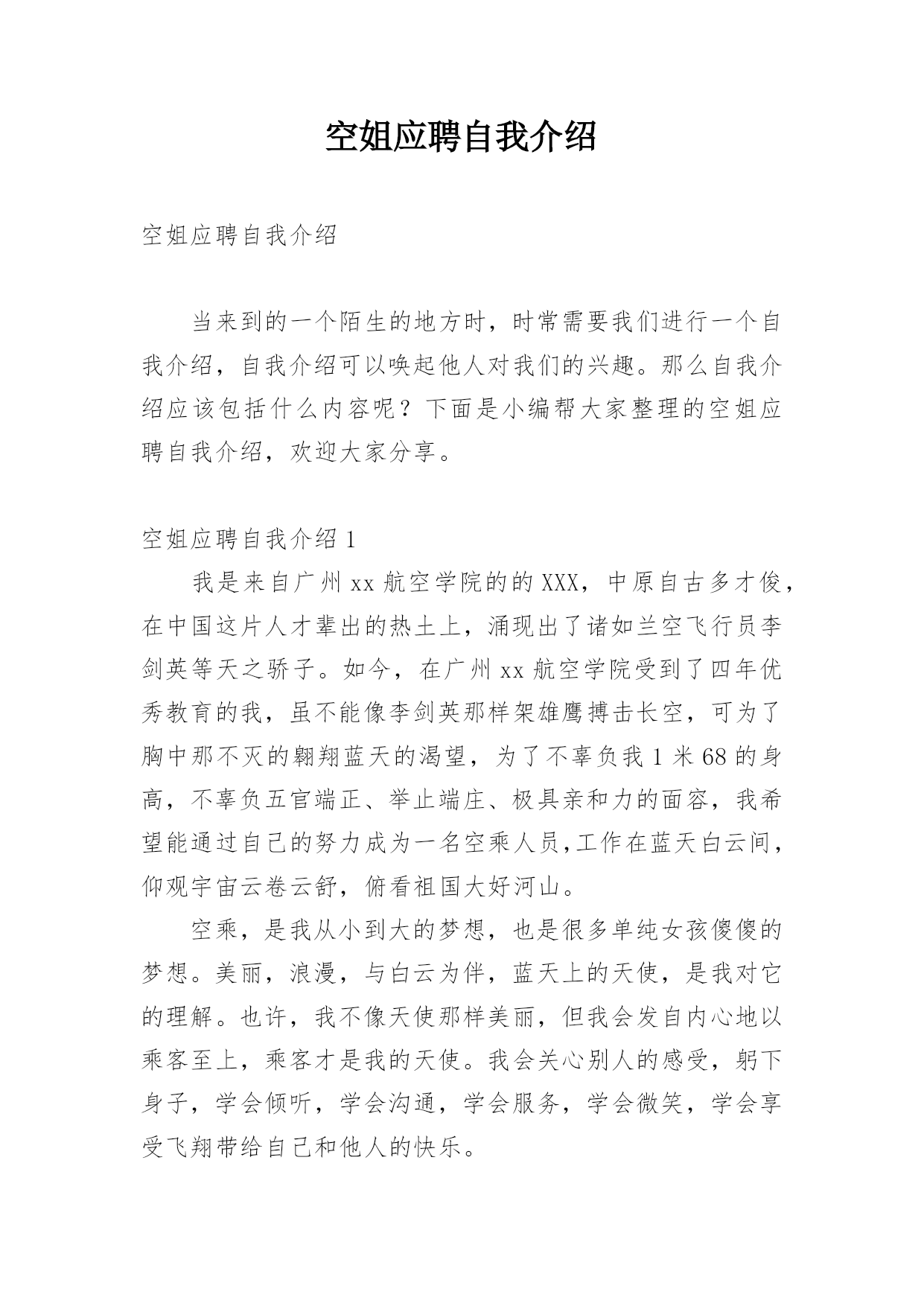 空姐应聘自我介绍空姐应聘自我介绍当来到的一个陌生的地方时,时常需要我们进行一个自我介绍,自我介绍可以唤起他人对我们的兴趣。那么自我介绍应该包括什么内容呢?下面是小编帮大家整理的空姐应聘自我介绍,欢迎大家分享。空姐应聘自我介绍1我是来自广州xx航空学院的的XXX,中原自古多才俊,在中国这片人才辈出的热土上,涌现出了诸如兰空飞行员李剑英等天之骄子。如今,在广州xx航空学院受到了四年优秀教育的我,虽不能像李剑英那样架雄鹰搏击长空,可为了胸中那不灭的翱翔蓝天的渴望,为了不辜负我1米68的身高,不辜负五官端正、举止