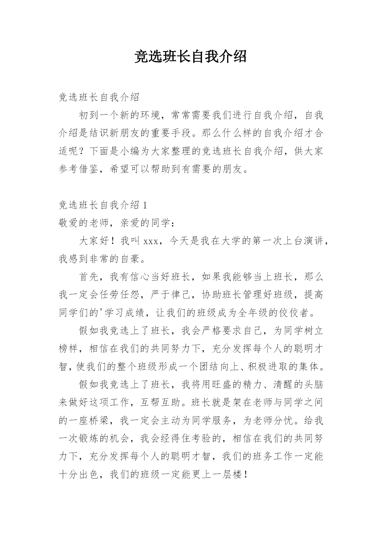 竞选班长自我介绍竞选班长自我介绍初到一个新的环境,常常需要我们进行自我介绍,自我介绍是结识新朋友的重要手段。那么什么样的自我介绍才合适呢?下面是小编为大家整理的竞选班长自我介绍,供大家参考借鉴,希望可以帮助到有需要的朋友。竞选班长自我介绍1敬爱的老师,亲爱的同学:大家好!我叫xxx,今天是我在大学的第一次上台演讲,我感到非常的自豪。首先,我有信心当好班长,如果我能够当上班长,那么我一定会任劳任怨,严于律己,协助班长管理好班级,提高同学们的'学习成绩,让我们的班级成为全年级的佼佼者。假如我竞选上了班长,我会