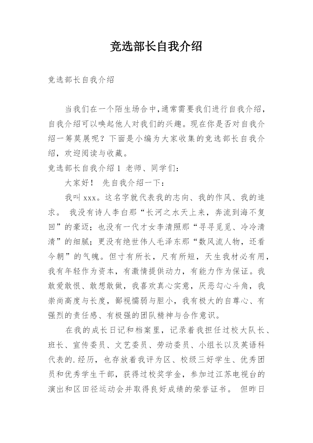 竞选部长自我介绍竞选部长自我介绍当我们在一个陌生场合中,通常需要我们进行自我介绍,自我介绍可以唤起他人对我们的兴趣。现在你是否对自我介绍一筹莫展呢?下面是小编为大家收集的竞选部长自我介绍,欢迎阅读与收藏。竞选部长自我介绍1老师、同学们:大家好!先自我介绍一下:我叫xxx。这名字就代表我的志向、我的作风、我的追求。我没有诗人李白那“长河之水天上来,奔流到海不复回”的豪迈;也没有一代才女李清照那“寻寻觅觅、冷冷清清”的细腻;更没有绝世伟人毛泽东那“数风流人物,还看今朝”的气魄。但寸有所长,尺有所短,天生我材必