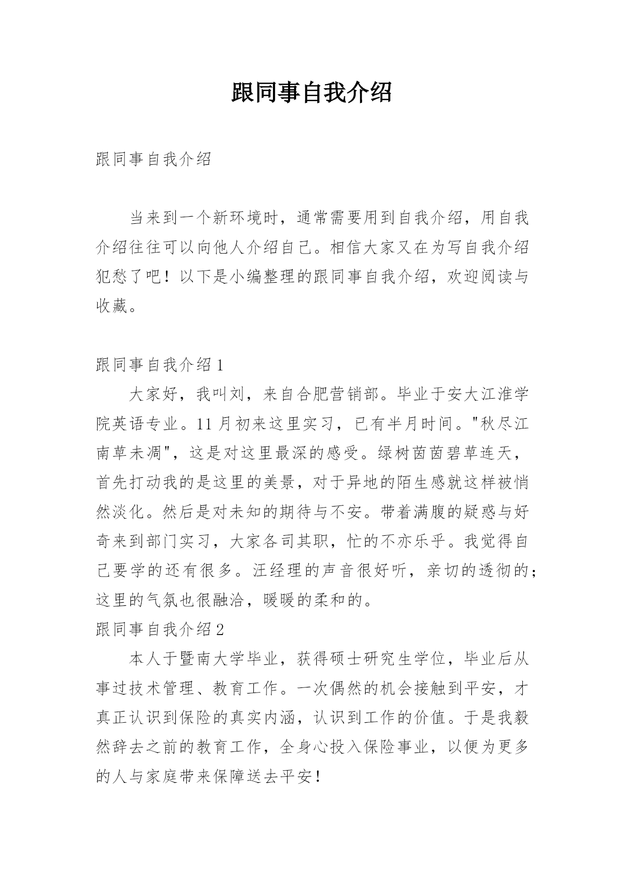 跟同事自我介绍跟同事自我介绍当来到一个新环境时,通常需要用到自我介绍,用自我介绍往往可以向他人介绍自己。相信大家又在为写自我介绍犯愁了吧!以下是小编整理的跟同事自我介绍,欢迎阅读与收藏。跟同事自我介绍1大家好,我叫刘,来自合肥营销部。毕业于安大江淮学院英语专业。11月初来这里实习,已有半月时间。"秋尽江南草未凋",这是对这里最深的感受。绿树茵茵碧草连天,首先打动我的是这里的美景,对于异地的陌生感就这样被悄然淡化。然后是对未知的期待与不安。带着满腹的疑惑与好奇来到部门实习,大家各司其职,忙的不亦乐乎。我觉得
