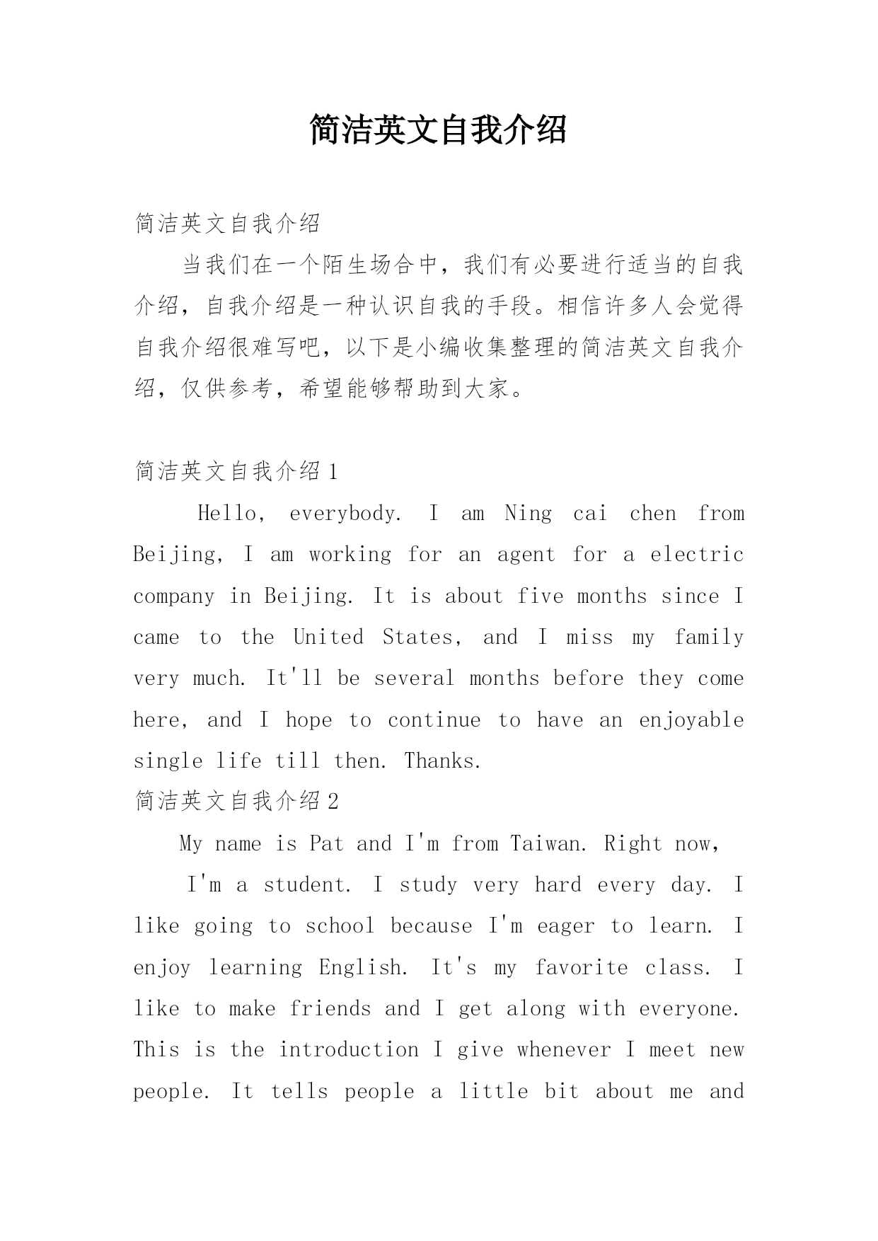 简洁英文自我介绍简洁英文自我介绍当我们在一个陌生场合中,我们有必要进行适当的自我介绍,自我介绍是一种认识自我的手段。相信许多人会觉得自我介绍很难写吧,以下是小编收集整理的简洁英文自我介绍,仅供参考,希望能够帮助到大家。简洁英文自我介绍1Hello,everybody.IamNingcaichenfromBeijing,IamworkingforanagentforaelectriccompanyinBeijing.ItisaboutfivemonthssinceIcametotheUnitedStates