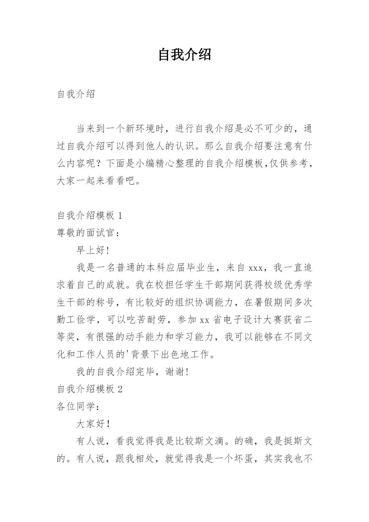 自我介绍自我介绍当来到一个新环境时,进行自我介绍是必不可少的,通过自我介绍可以得到他人的认识。那么自我介绍要注意有什么内容呢?下面是小编精心整理的自我介绍模板,仅供参考,大家一起来看看吧。自我介绍模板1尊敬的面试官:早上好!我是一名普通的本科应届毕业生,来自xxx,我一直追求着自己的成就。我在校担任学生干部期间获得校级优秀学生干部的称号,有比较好的组织协调能力,在暑假期间多次勤工俭学,可以吃苦耐劳,参加xx省电子设计大赛获省二等奖,有很强的动手能力和学习能力,我可以能够在不同文化和工作人员的'背景下出色地