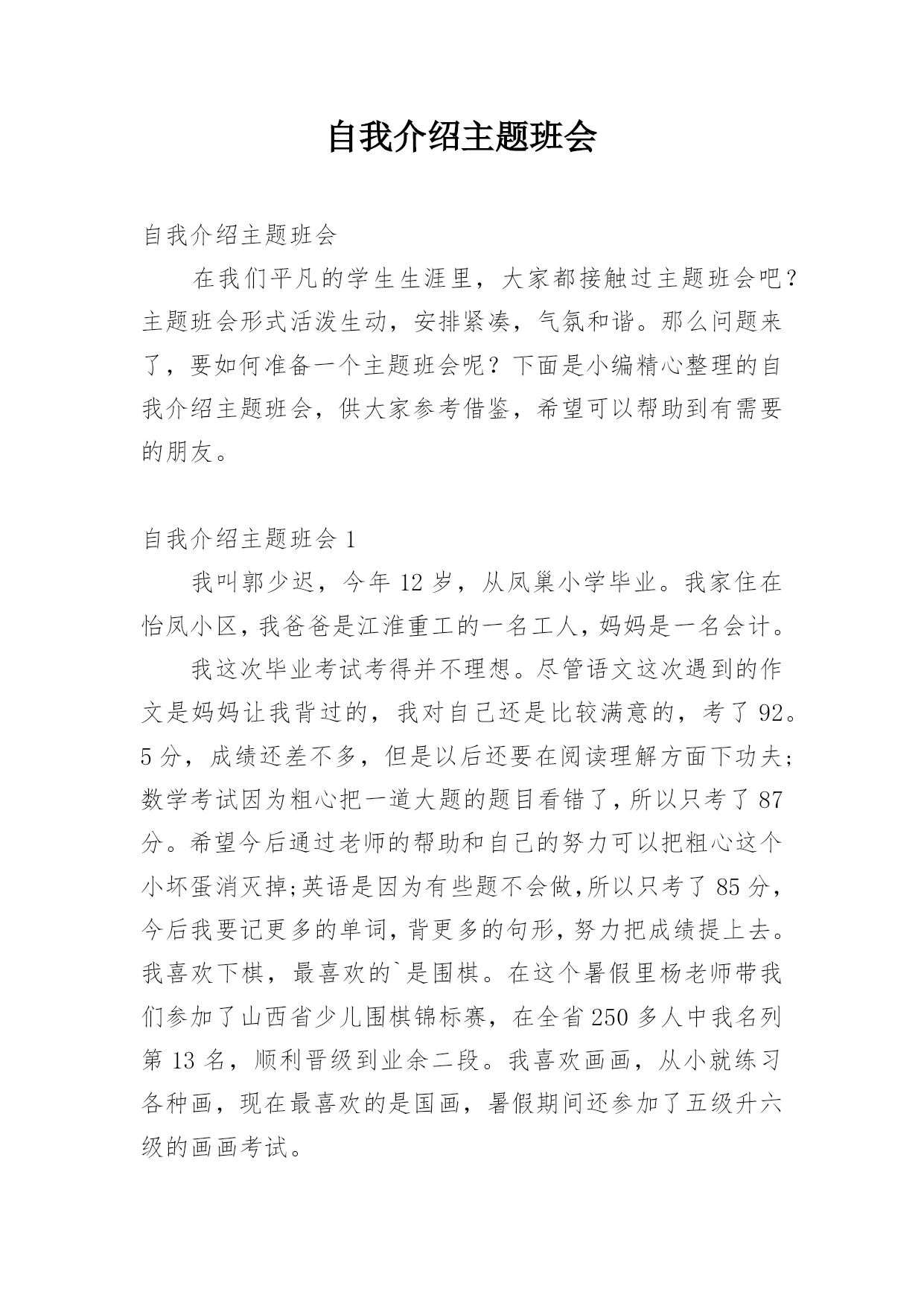 自我介绍主题班会自我介绍主题班会在我们平凡的学生生涯里,大家都接触过主题班会吧?主题班会形式活泼生动,安排紧凑,气氛和谐。那么问题来了,要如何准备一个主题班会呢?下面是小编精心整理的自我介绍主题班会,供大家参考借鉴,希望可以帮助到有需要的朋友。自我介绍主题班会1我叫郭少迟,今年12岁,从凤巢小学毕业。我家住在怡凤小区,我爸爸是江淮重工的一名工人,妈妈是一名会计。我这次毕业考试考得并不理想。尽管语文这次遇到的作文是妈妈让我背过的,我对自己还是比较满意的,考了92。5分,成绩还差不多,但是以后还要在阅读理解方
