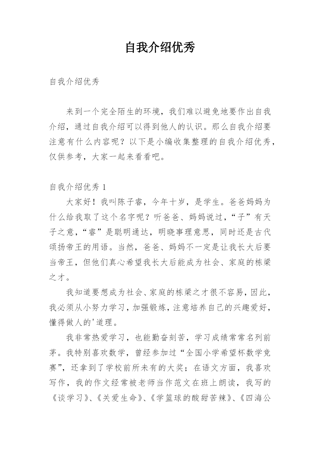 自我介绍优秀自我介绍优秀来到一个完全陌生的环境,我们难以避免地要作出自我介绍,通过自我介绍可以得到他人的认识。那么自我介绍要注意有什么内容呢?以下是小编收集整理的自我介绍优秀,仅供参考,大家一起来看看吧。自我介绍优秀1大家好!我叫陈子睿,今年十岁,是学生。爸爸妈妈为什么给我取了这个名字呢?听爸爸、妈妈说过,“子”有天子之意,“睿”是聪明通达,明晓事理意思,同时还是古代颂扬帝王的用语。当然,爸爸、妈妈不一定是让我长大后要当帝王,但他们真心希望我长大后能成为社会、家庭的栋梁之才。我知道要想成为社会、家庭的栋梁