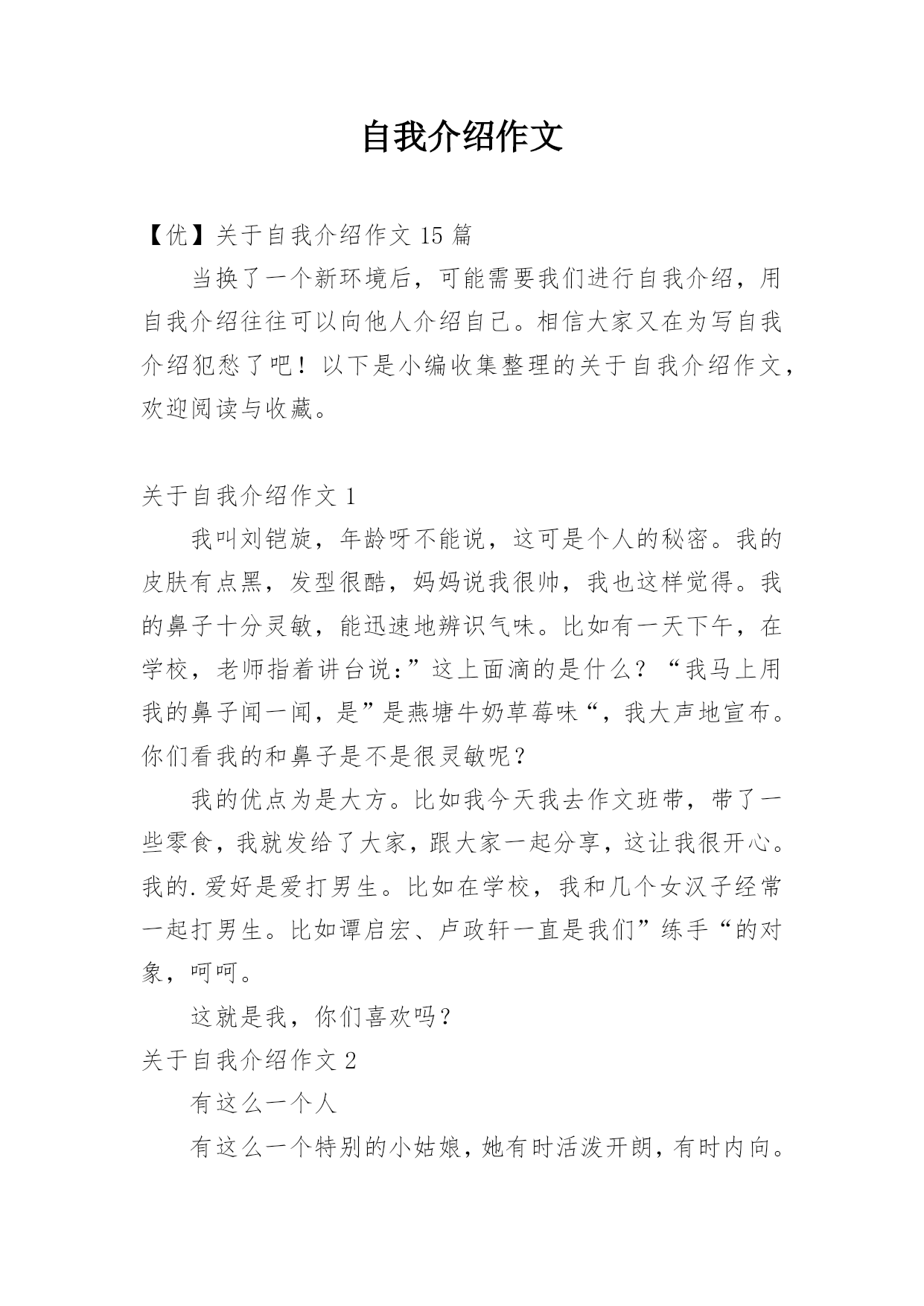自我介绍作文【优】关于自我介绍作文15篇当换了一个新环境后,可能需要我们进行自我介绍,用自我介绍往往可以向他人介绍自己。相信大家又在为写自我介绍犯愁了吧!以下是小编收集整理的关于自我介绍作文,欢迎阅读与收藏。关于自我介绍作文1我叫刘铠旋,年龄呀不能说,这可是个人的秘密。我的皮肤有点黑,发型很酷,妈妈说我很帅,我也这样觉得。我的鼻子十分灵敏,能迅速地辨识气味。比如有一天下午,在学校,老师指着讲台说:”这上面滴的是什么?“我马上用我的鼻子闻一闻,是”是燕塘牛奶草莓味“,我大声地宣布。你们看我的和鼻子是不是很灵