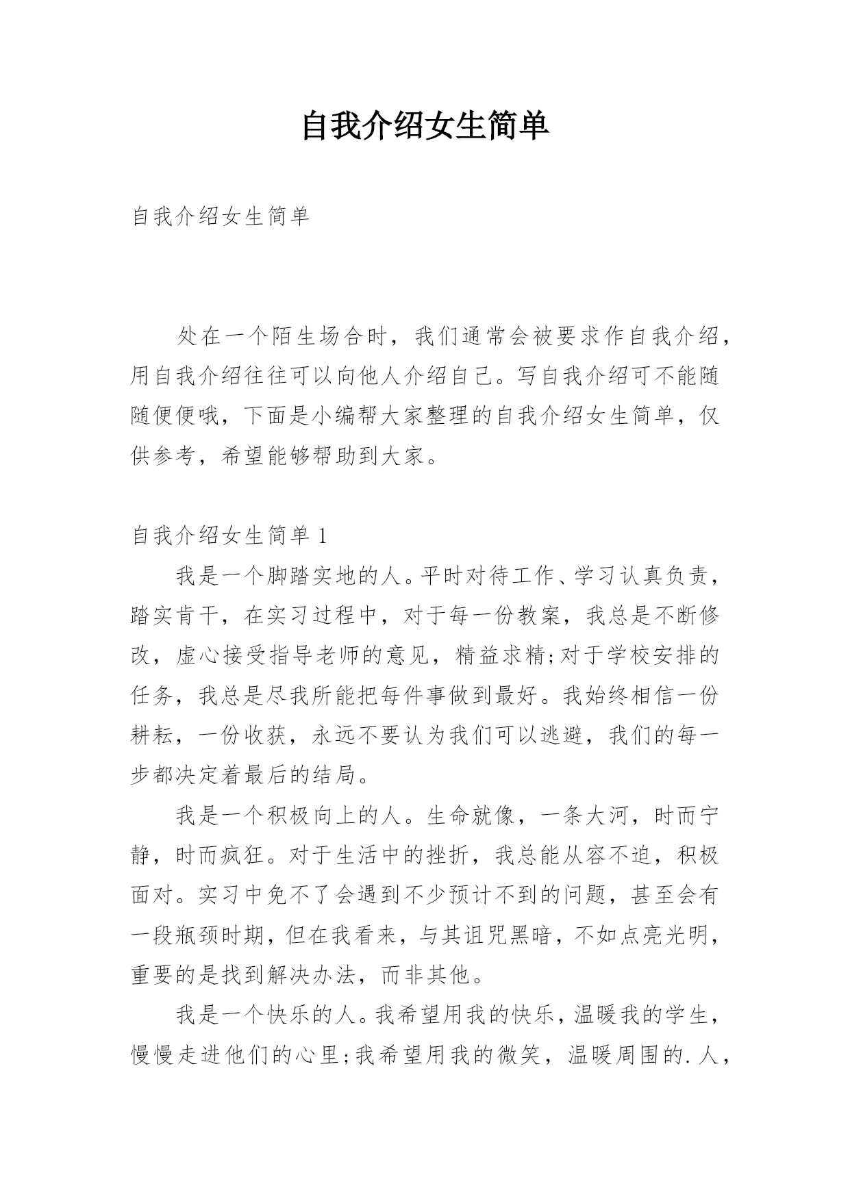 自我介绍女生简单自我介绍女生简单处在一个陌生场合时,我们通常会被要求作自我介绍,用自我介绍往往可以向他人介绍自己。写自我介绍可不能随随便便哦,下面是小编帮大家整理的自我介绍女生简单,仅供参考,希望能够帮助到大家。自我介绍女生简单1我是一个脚踏实地的人。平时对待工作、学习认真负责,踏实肯干,在实习过程中,对于每一份教案,我总是不断修改,虚心接受指导老师的意见,精益求精;对于学校安排的任务,我总是尽我所能把每件事做到最好。我始终相信一份耕耘,一份收获,永远不要认为我们可以逃避,我们的每一步都决定着最后的结局。