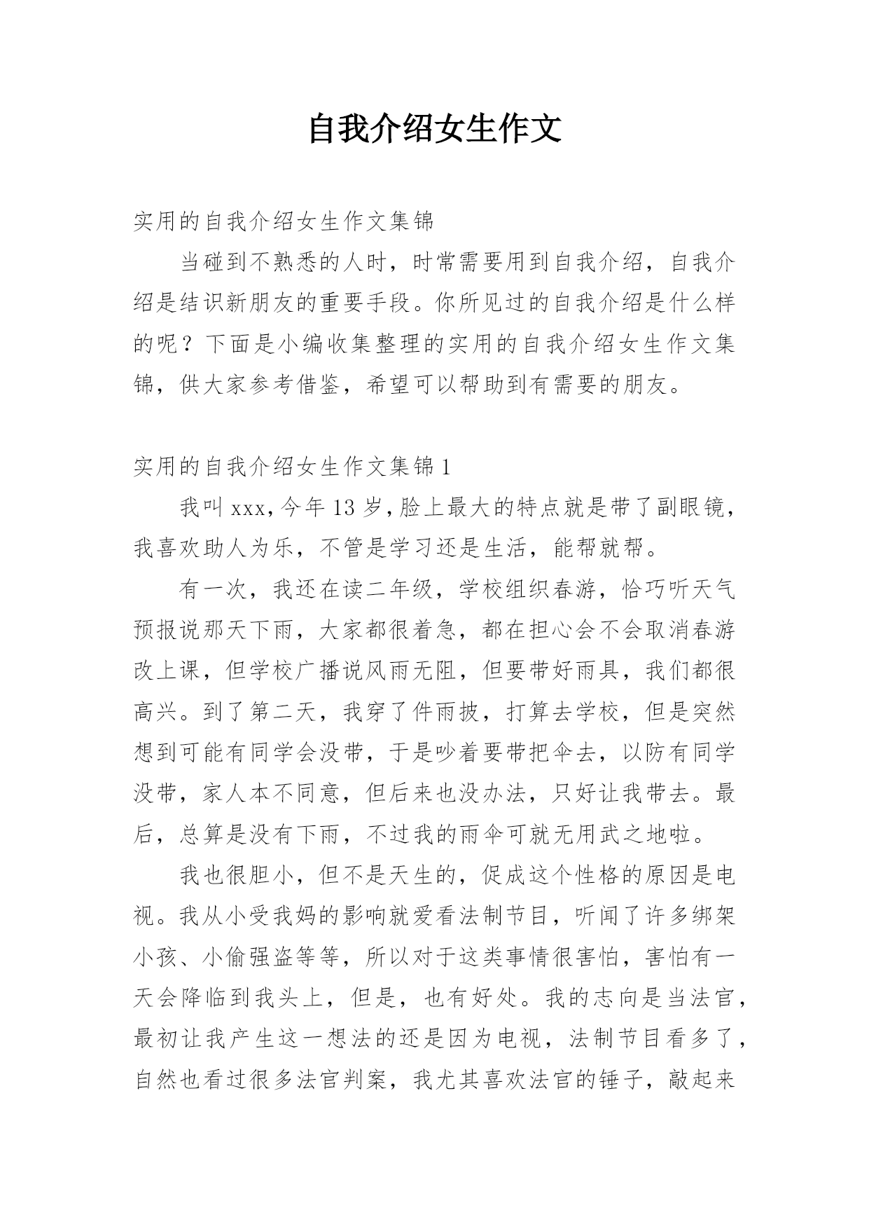 自我介绍女生作文实用的自我介绍女生作文集锦当碰到不熟悉的人时,时常需要用到自我介绍,自我介绍是结识新朋友的重要手段。你所见过的自我介绍是什么样的呢?下面是小编收集整理的实用的自我介绍女生作文集锦,供大家参考借鉴,希望可以帮助到有需要的朋友。实用的自我介绍女生作文集锦1我叫xxx,今年13岁,脸上最大的特点就是带了副眼镜,我喜欢助人为乐,不管是学习还是生活,能帮就帮。有一次,我还在读二年级,学校组织春游,恰巧听天气预报说那天下雨,大家都很着急,都在担心会不会取消春游改上课,但学校广播说风雨无阻,但要带好雨具