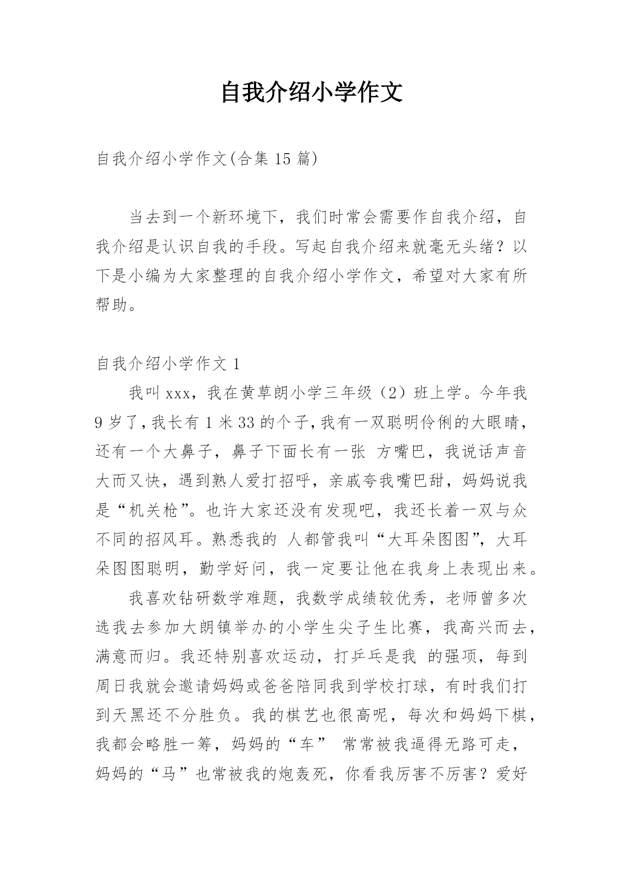 自我介绍小学作文自我介绍小学作文(合集15篇)当去到一个新环境下,我们时常会需要作自我介绍,自我介绍是认识自我的手段。写起自我介绍来就毫无头绪?以下是小编为大家整理的自我介绍小学作文,希望对大家有所帮助。自我介绍小学作文1我叫xxx,我在黄草朗小学三年级(2)班上学。今年我9岁了,我长有1米33的个子,我有一双聪明伶俐的大眼睛,还有一个大鼻子,鼻子下面长有一张方嘴巴,我说话声音大而又快,遇到熟人爱打招呼,亲戚夸我嘴巴甜,妈妈说我是“机关枪”。也许大家还没有发现吧,我还长着一双与众不同的招风耳。熟悉我的人都