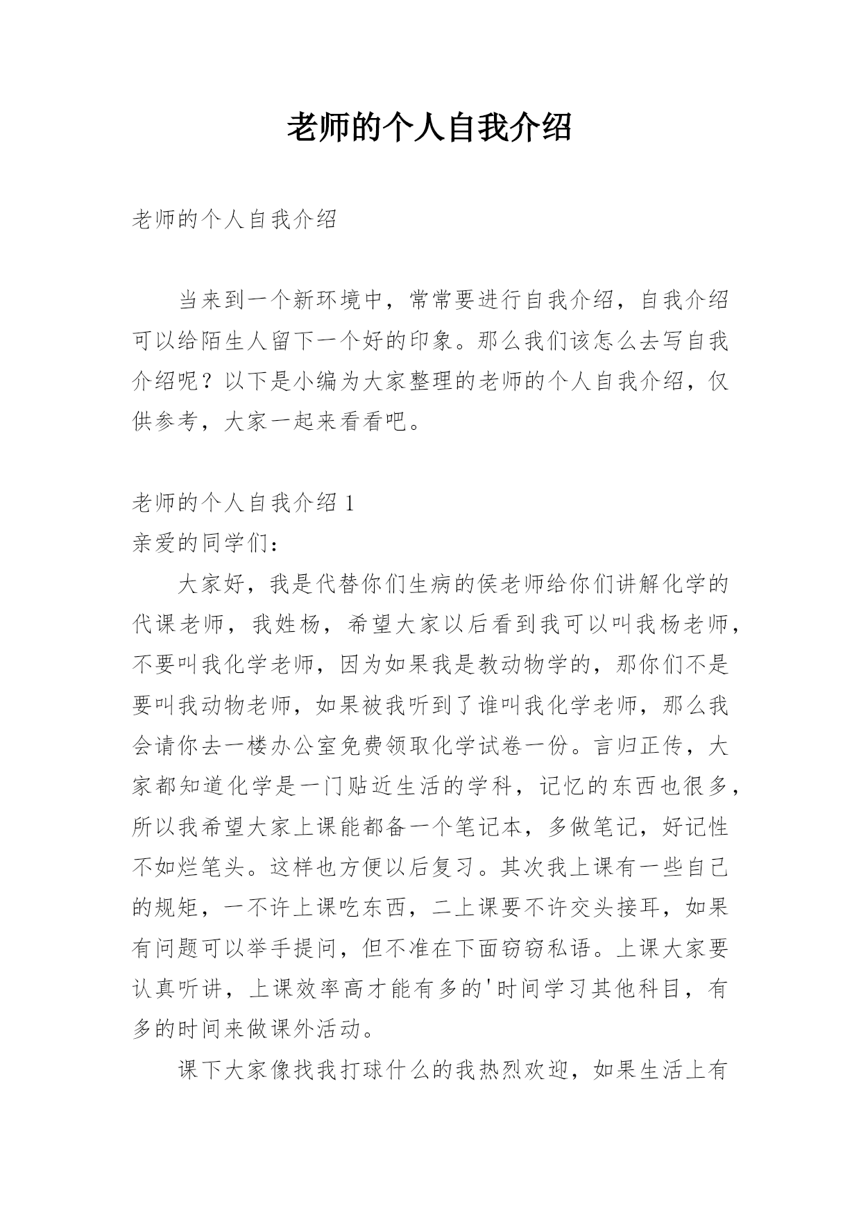 老师的个人自我介绍老师的个人自我介绍当来到一个新环境中,常常要进行自我介绍,自我介绍可以给陌生人留下一个好的印象。那么我们该怎么去写自我介绍呢?以下是小编为大家整理的老师的个人自我介绍,仅供参考,大家一起来看看吧。老师的个人自我介绍1亲爱的同学们:大家好,我是代替你们生病的侯老师给你们讲解化学的代课老师,我姓杨,希望大家以后看到我可以叫我杨老师,不要叫我化学老师,因为如果我是教动物学的,那你们不是要叫我动物老师,如果被我听到了谁叫我化学老师,那么我会请你去一楼办公室免费领取化学试卷一份。言归正传,大家都知