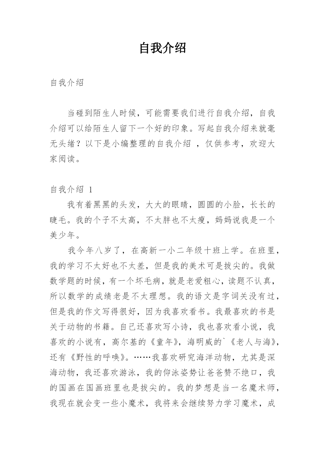 自我介绍自我介绍当碰到陌生人时候,可能需要我们进行自我介绍,自我介绍可以给陌生人留下一个好的印象。写起自我介绍来就毫无头绪?以下是小编整理的自我介绍,仅供参考,欢迎大家阅读。自我介绍1我有着黑黑的头发,大大的眼睛,圆圆的小脸,长长的睫毛。我的个子不太高,不太胖也不太瘦,妈妈说我是一个美少年。我今年八岁了,在高新一小二年级十班上学。在班里,我的学习不太好也不太差,但是我的美术可是拔尖的。我做数学题的时候,有一个坏毛病,就是老爱粗心,读题不认真,所以数学的成绩老是不太理想。我的语文是字词关没有过,但是我的作文