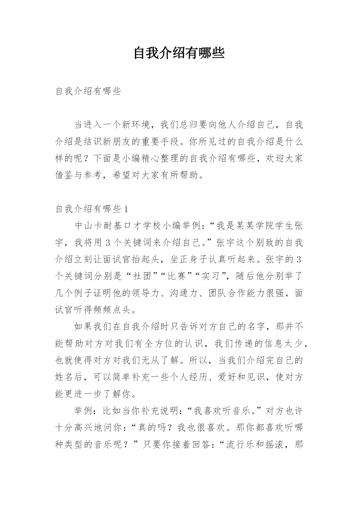 自我介绍有哪些自我介绍有哪些当进入一个新环境,我们总归要向他人介绍自己,自我介绍是结识新朋友的重要手段。你所见过的自我介绍是什么样的呢?下面是小编精心整理的自我介绍有哪些,欢迎大家借鉴与参考,希望对大家有所帮助。自我介绍有哪些1中山卡耐基口才学校小编举例:“我是某某学院学生张宇,我将用3个关键词来介绍自己。”张宇这个别致的自我介绍立刻让面试官抬起头,坐正身子认真听起来。张宇的3个关键词分别是“社团”“比赛”“实习”,随后他分别举了几个例子证明他的领导力、沟通力、团队合作能力很强,面试官听得频频点头。如果我