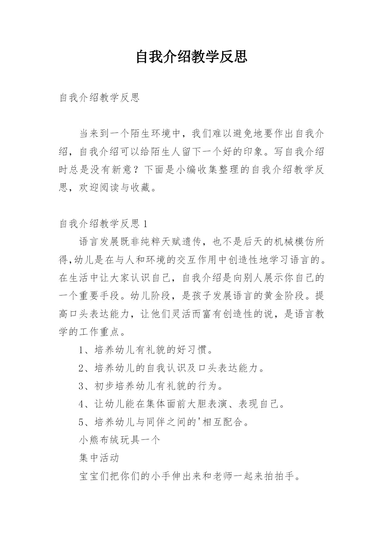 自我介绍教学反思自我介绍教学反思当来到一个陌生环境中,我们难以避免地要作出自我介绍,自我介绍可以给陌生人留下一个好的印象。写自我介绍时总是没有新意?下面是小编收集整理的自我介绍教学反思,欢迎阅读与收藏。自我介绍教学反思1语言发展既非纯粹天赋遗传,也不是后天的机械模仿所得,幼儿是在与人和环境的交互作用中创造性地学习语言的。在生活中让大家认识自己,自我介绍是向别人展示你自己的一个重要手段。幼儿阶段,是孩子发展语言的黄金阶段。提高口头表达能力,让他们灵活而富有创造性的说,是语言教学的工作重点。1、培养幼儿有礼貌