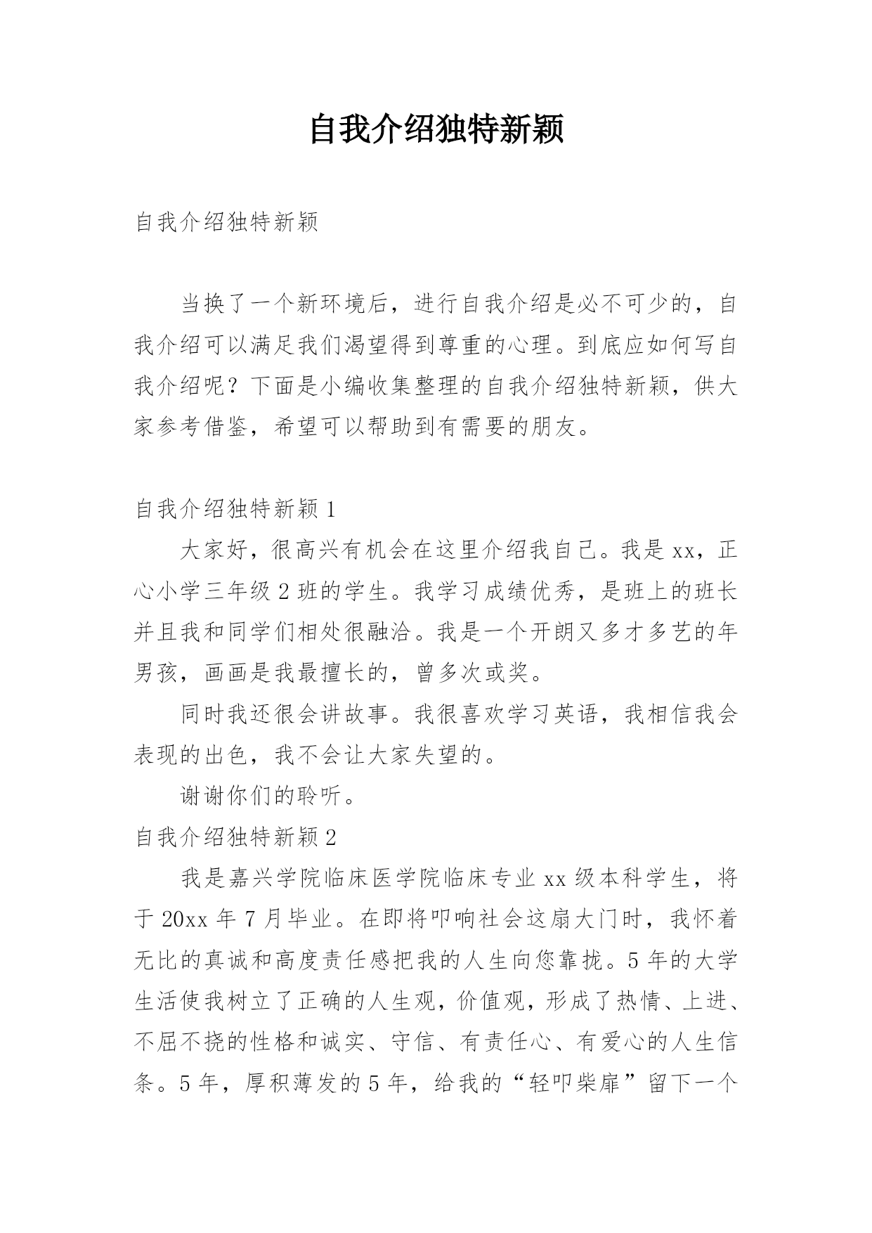 自我介绍独特新颖自我介绍独特新颖当换了一个新环境后,进行自我介绍是必不可少的,自我介绍可以满足我们渴望得到尊重的心理。到底应如何写自我介绍呢?下面是小编收集整理的自我介绍独特新颖,供大家参考借鉴,希望可以帮助到有需要的朋友。自我介绍独特新颖1大家好,很高兴有机会在这里介绍我自己。我是xx,正心小学三年级2班的学生。我学习成绩优秀,是班上的班长并且我和同学们相处很融洽。我是一个开朗又多才多艺的年男孩,画画是我最擅长的,曾多次或奖。同时我还很会讲故事。我很喜欢学习英语,我相信我会表现的出色,我不会让大家失望的