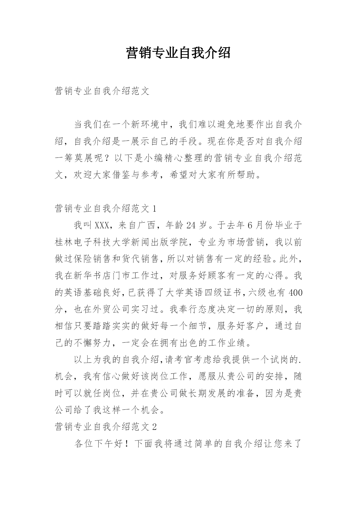 营销专业自我介绍营销专业自我介绍范文当我们在一个新环境中,我们难以避免地要作出自我介绍,自我介绍是一展示自己的手段。现在你是否对自我介绍一筹莫展呢?以下是小编精心整理的营销专业自我介绍范文,欢迎大家借鉴与参考,希望对大家有所帮助。营销专业自我介绍范文1我叫XXX,来自广西,年龄24岁。于去年6月份毕业于桂林电子科技大学新闻出版学院,专业为市场营销,我以前做过保险销售和货代销售,所以对销售有一定的经验。此外,我在新华书店门市工作过,对服务好顾客有一定的心得。我的英语基础良好,已获得了大学英语四级证书,六级也