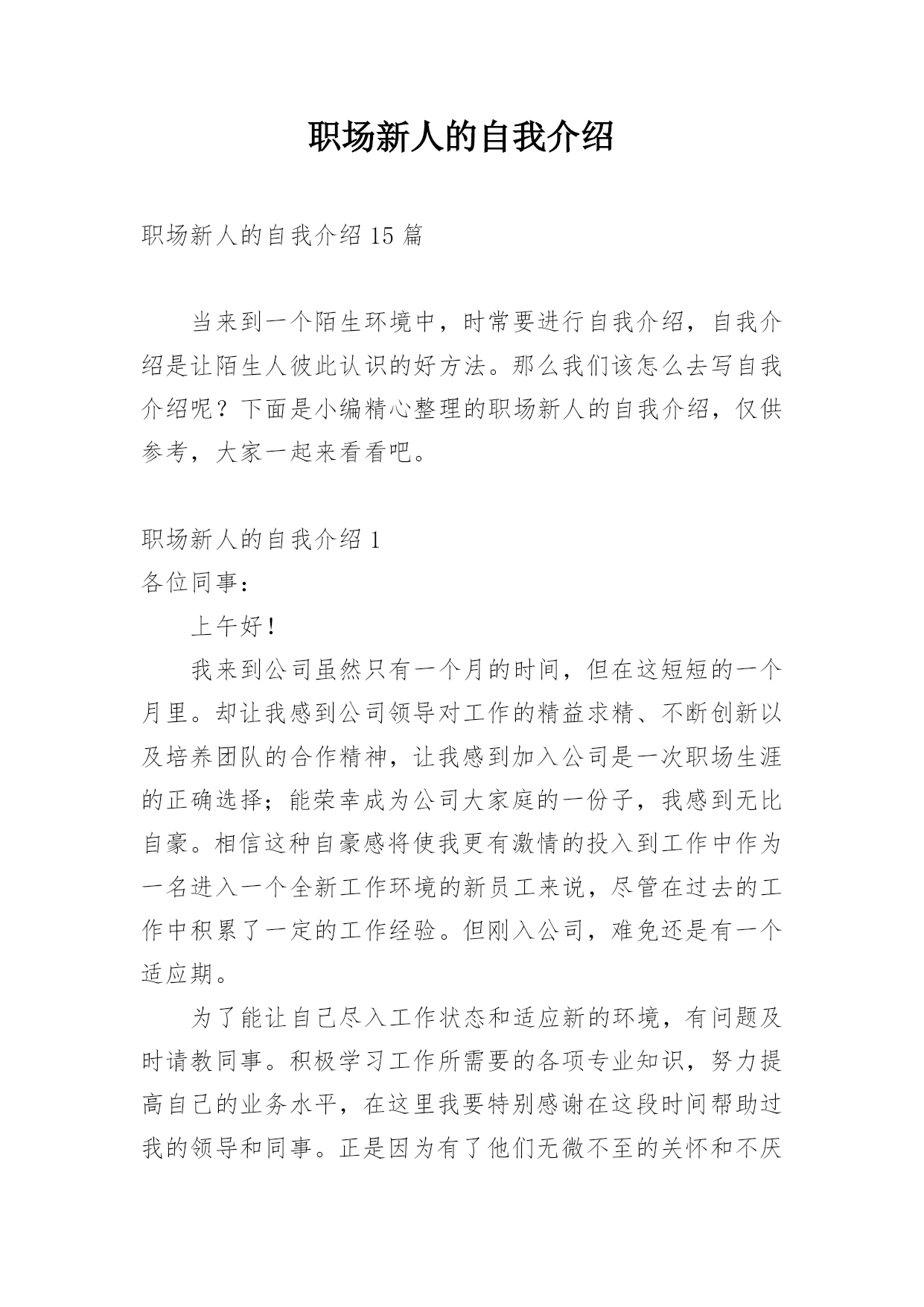 职场新人的自我介绍职场新人的自我介绍15篇当来到一个陌生环境中,时常要进行自我介绍,自我介绍是让陌生人彼此认识的好方法。那么我们该怎么去写自我介绍呢?下面是小编精心整理的职场新人的自我介绍,仅供参考,大家一起来看看吧。职场新人的自我介绍1各位同事:上午好!我来到公司虽然只有一个月的时间,但在这短短的一个月里。却让我感到公司领导对工作的精益求精、不断创新以及培养团队的合作精神,让我感到加入公司是一次职场生涯的正确选择;能荣幸成为公司大家庭的一份子,我感到无比自豪。相信这种自豪感将使我更有激情的投入到工作中作