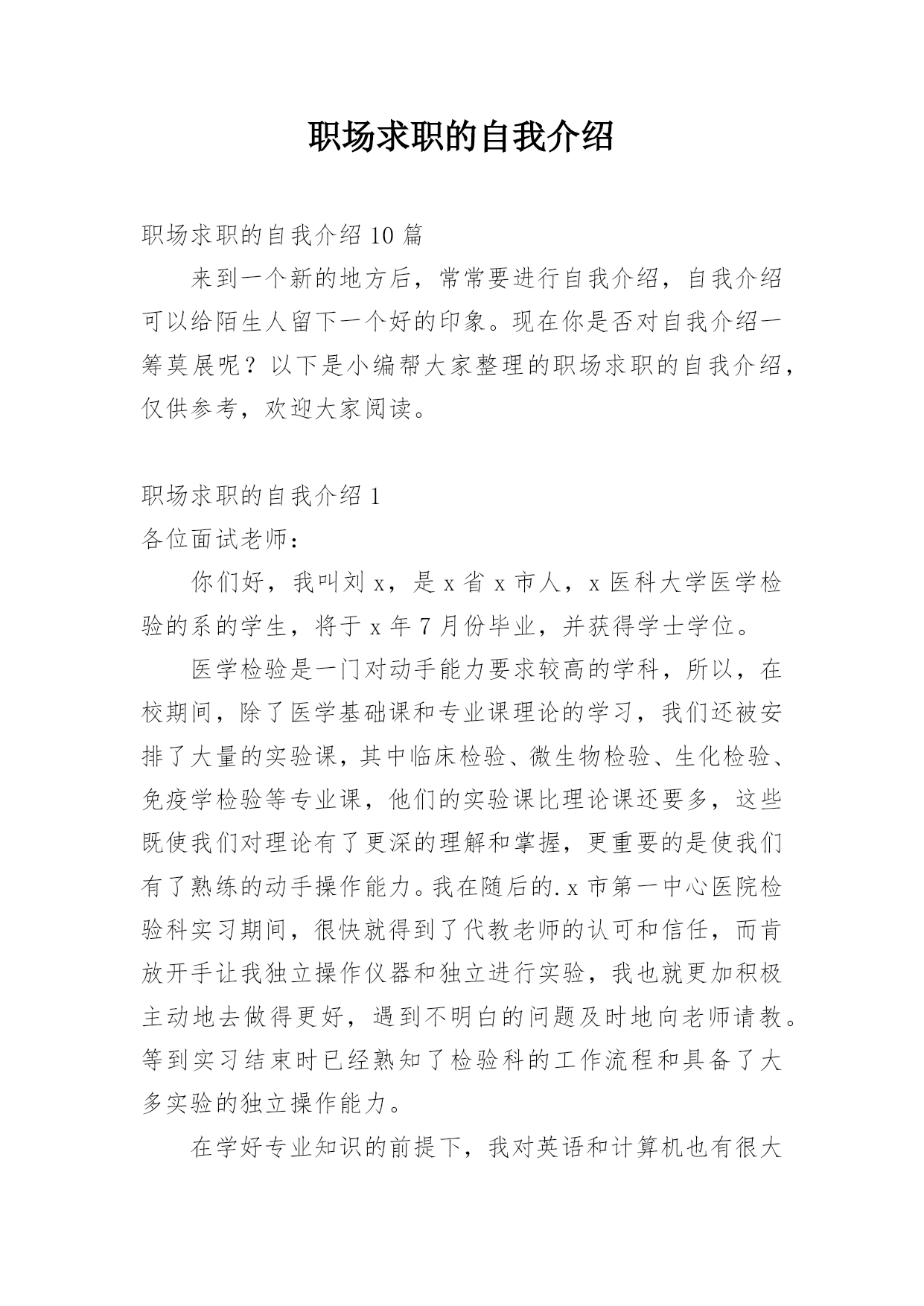 职场求职的自我介绍职场求职的自我介绍10篇来到一个新的地方后,常常要进行自我介绍,自我介绍可以给陌生人留下一个好的印象。现在你是否对自我介绍一筹莫展呢?以下是小编帮大家整理的职场求职的自我介绍,仅供参考,欢迎大家阅读。职场求职的自我介绍1各位面试老师:你们好,我叫刘x,是x省x市人,x医科大学医学检验的系的学生,将于x年7月份毕业,并获得学士学位。医学检验是一门对动手能力要求较高的学科,所以,在校期间,除了医学基础课和专业课理论的学习,我们还被安排了大量的实验课,其中临床检验、微生物检验、生化检验、免疫学