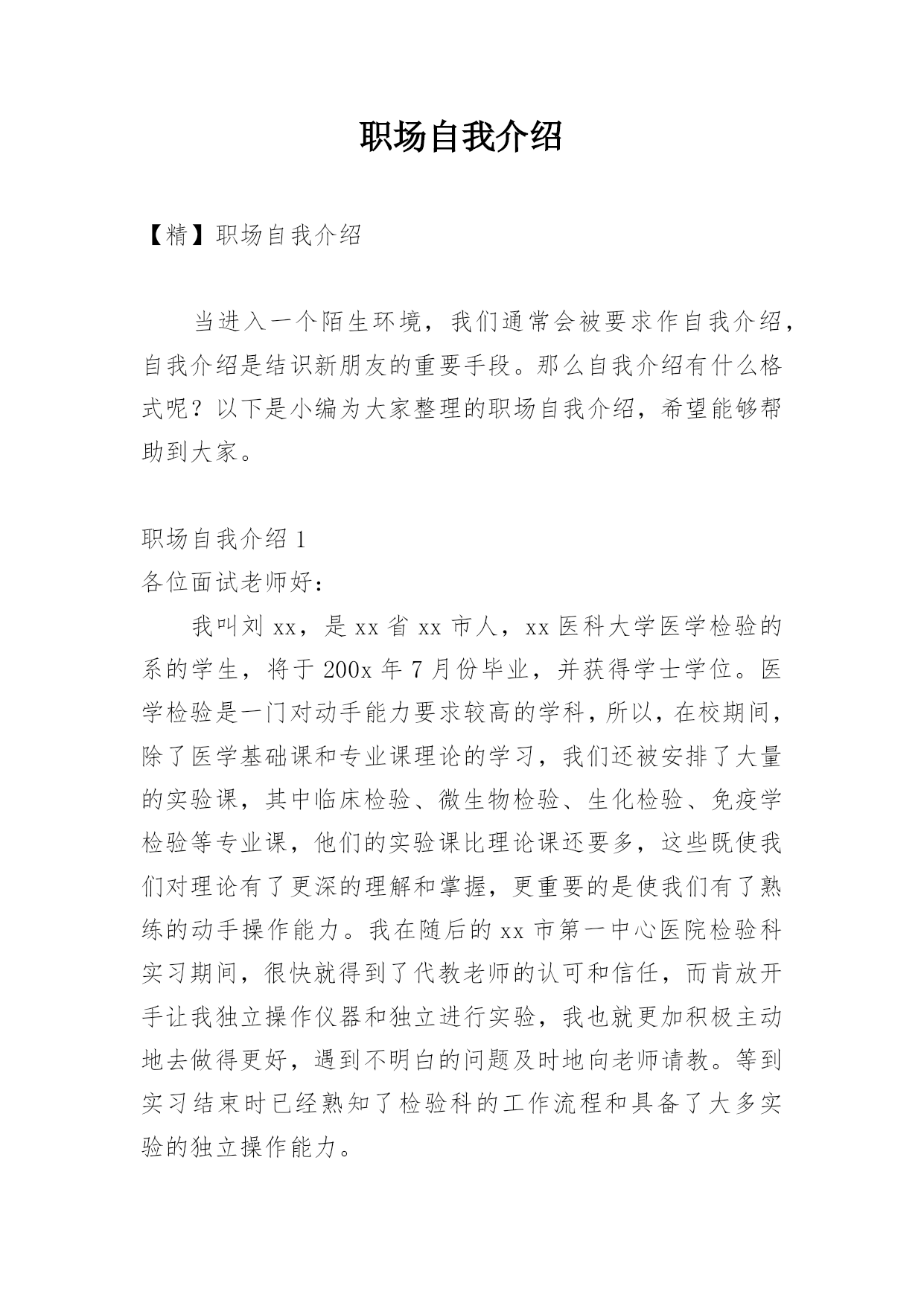 职场自我介绍【精】职场自我介绍当进入一个陌生环境,我们通常会被要求作自我介绍,自我介绍是结识新朋友的重要手段。那么自我介绍有什么格式呢?以下是小编为大家整理的职场自我介绍,希望能够帮助到大家。职场自我介绍1各位面试老师好:我叫刘xx,是xx省xx市人,xx医科大学医学检验的系的学生,将于200x年7月份毕业,并获得学士学位。医学检验是一门对动手能力要求较高的学科,所以,在校期间,除了医学基础课和专业课理论的学习,我们还被安排了大量的实验课,其中临床检验、微生物检验、生化检验、免疫学检验等专业课,他们的实验