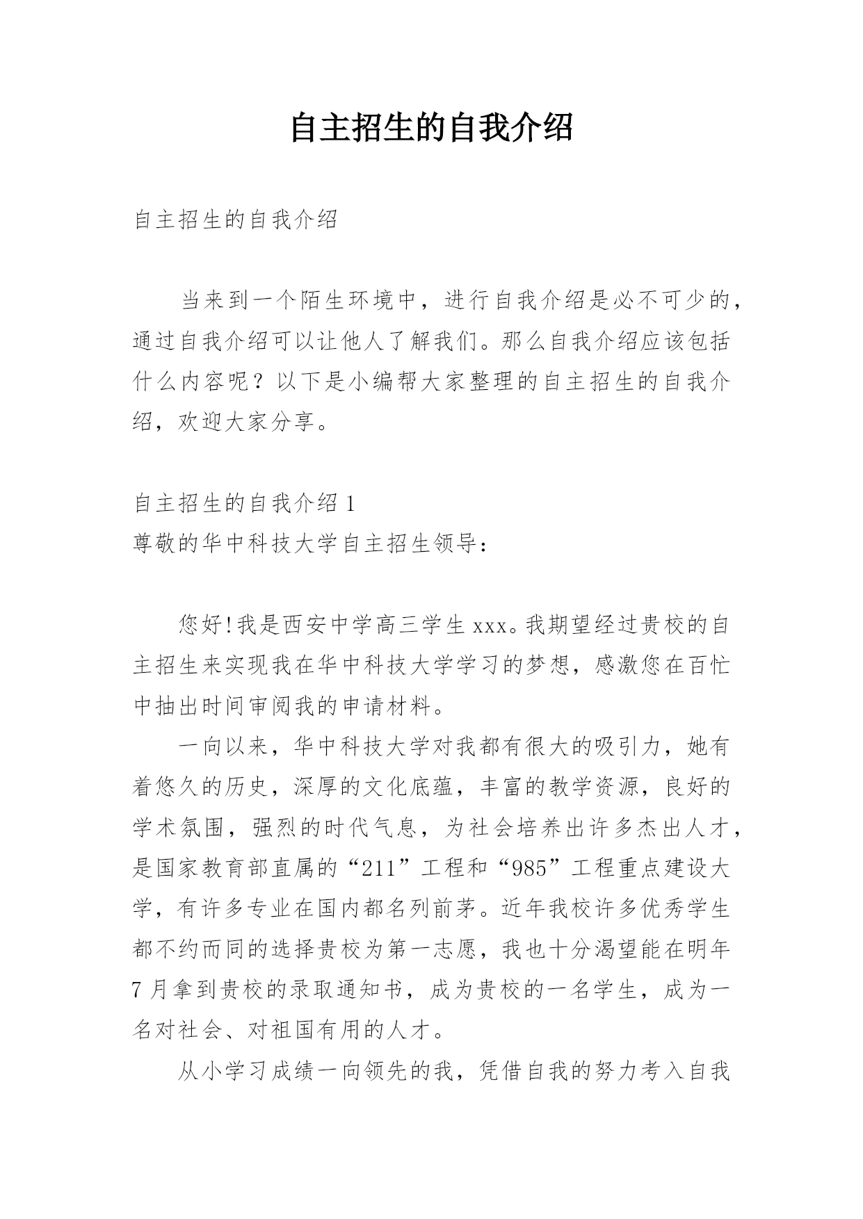 自主招生的自我介绍自主招生的自我介绍当来到一个陌生环境中,进行自我介绍是必不可少的,通过自我介绍可以让他人了解我们。那么自我介绍应该包括什么内容呢?以下是小编帮大家整理的自主招生的自我介绍,欢迎大家分享。自主招生的自我介绍1尊敬的华中科技大学自主招生领导:您好!我是西安中学高三学生xxx。我期望经过贵校的自主招生来实现我在华中科技大学学习的梦想,感激您在百忙中抽出时间审阅我的申请材料。一向以来,华中科技大学对我都有很大的吸引力,她有着悠久的历史,深厚的文化底蕴,丰富的教学资源,良好的学术氛围,强烈的时代气
