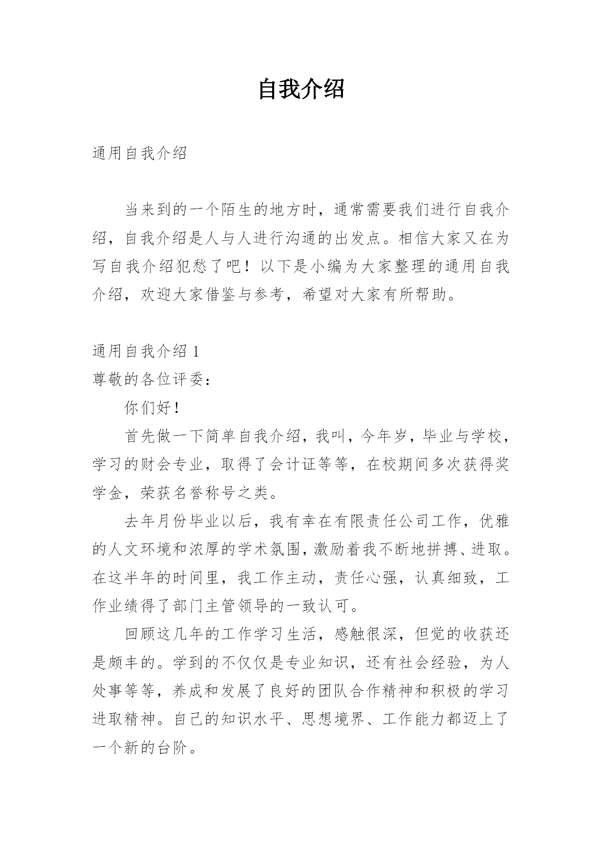 自我介绍通用自我介绍当来到的一个陌生的地方时,通常需要我们进行自我介绍,自我介绍是人与人进行沟通的出发点。相信大家又在为写自我介绍犯愁了吧!以下是小编为大家整理的通用自我介绍,欢迎大家借鉴与参考,希望对大家有所帮助。通用自我介绍1尊敬的各位评委:你们好!首先做一下简单自我介绍,我叫,今年岁,毕业与学校,学习的财会专业,取得了会计证等等,在校期间多次获得奖学金,荣获名誉称号之类。去年月份毕业以后,我有幸在有限责任公司工作,优雅的人文环境和浓厚的学术氛围,激励着我不断地拼搏、进取。在这半年的时间里,我工作主动