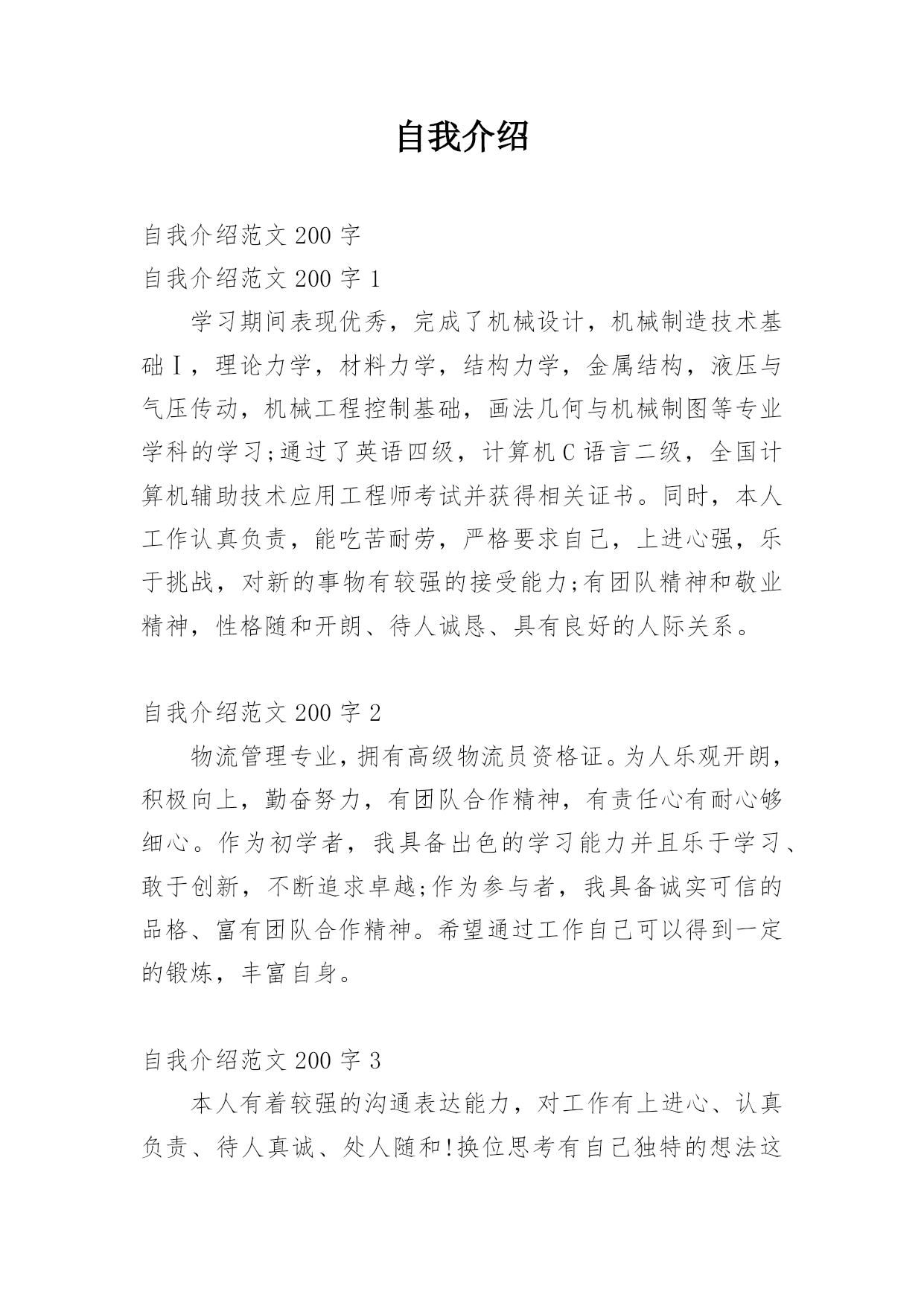 自我介绍自我介绍范文200字自我介绍范文200字1学习期间表现优秀,完成了机械设计,机械制造技术基础Ⅰ,理论力学,材料力学,结构力学,金属结构,液压与气压传动,机械工程控制基础,画法几何与机械制图等专业学科的学习;通过了英语四级,计算机C语言二级,全国计算机辅助技术应用工程师考试并获得相关证书。同时,本人工作认真负责,能吃苦耐劳,严格要求自己,上进心强,乐于挑战,对新的事物有较强的接受能力;有团队精神和敬业精神,性格随和开朗、待人诚恳、具有良好的人际关系。自我介绍范文200字2物流管理专业,拥有高级物流员