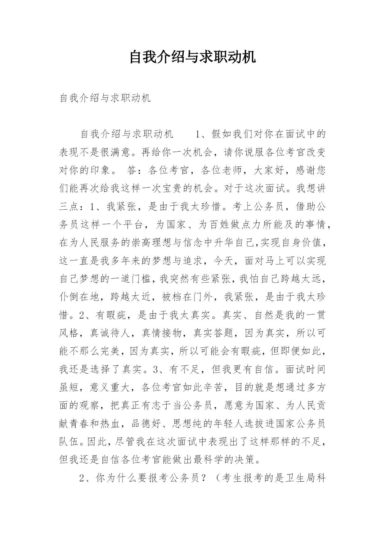自我介绍与求职动机自我介绍与求职动机自我介绍与求职动机1、假如我们对你在面试中的表现不是很满意。再给你一次机会,请你说服各位考官改变对你的印象。答:各位考官,各位老师,大家好,感谢您们能再次给我这样一次宝贵的机会。对于这次面试。我想讲三点:1、我紧张,是由于我太珍惜。考上公务员,借助公务员这样一个平台,为国家、为百姓做点力所能及的事情,在为人民服务的崇高理想与信念中升华自己,实现自身价值,这一直是我多年来的梦想与追求,今天,面对马上可以实现自己梦想的一道门槛,我突然有些紧张,我怕自己跨越太远,仆倒在地,跨