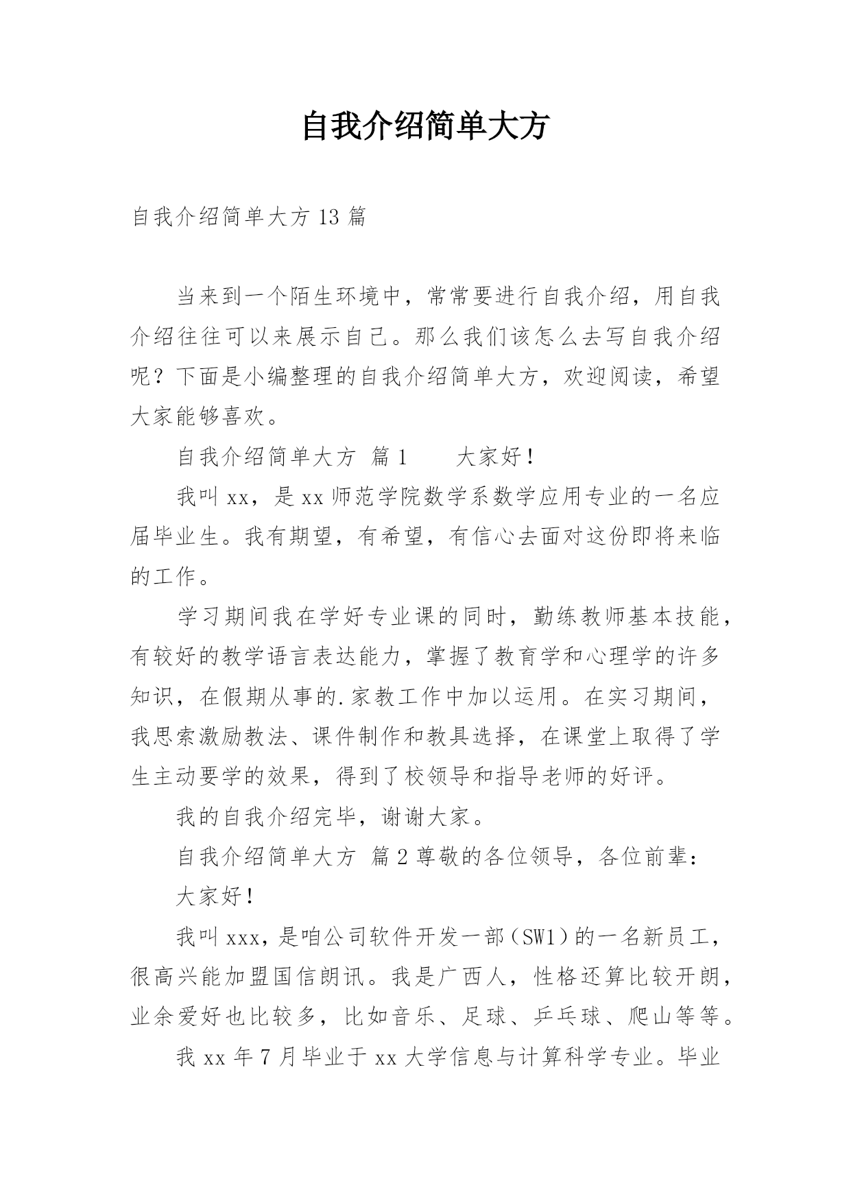 自我介绍简单大方自我介绍简单大方13篇当来到一个陌生环境中,常常要进行自我介绍,用自我介绍往往可以来展示自己。那么我们该怎么去写自我介绍呢?下面是小编整理的自我介绍简单大方,欢迎阅读,希望大家能够喜欢。自我介绍简单大方篇1大家好!我叫xx,是xx师范学院数学系数学应用专业的一名应届毕业生。我有期望,有希望,有信心去面对这份即将来临的工作。学习期间我在学好专业课的同时,勤练教师基本技能,有较好的教学语言表达能力,掌握了教育学和心理学的许多知识,在假期从事的.家教工作中加以运用。在实习期间,我思索激励教法、课