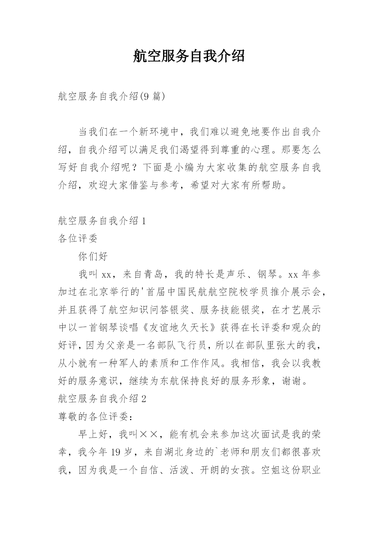 航空服务自我介绍航空服务自我介绍(9篇)当我们在一个新环境中,我们难以避免地要作出自我介绍,自我介绍可以满足我们渴望得到尊重的心理。那要怎么写好自我介绍呢?下面是小编为大家收集的航空服务自我介绍,欢迎大家借鉴与参考,希望对大家有所帮助。航空服务自我介绍1各位评委你们好我叫xx,来自青岛,我的特长是声乐、钢琴。xx年参加过在北京举行的'首届中国民航航空院校学员推介展示会,并且获得了航空知识问答银奖、服务技能银奖,在才艺展示中以一首钢琴谈唱《友谊地久天长》获得在长评委和观众的好评,因为父亲是一名部队飞行员,所