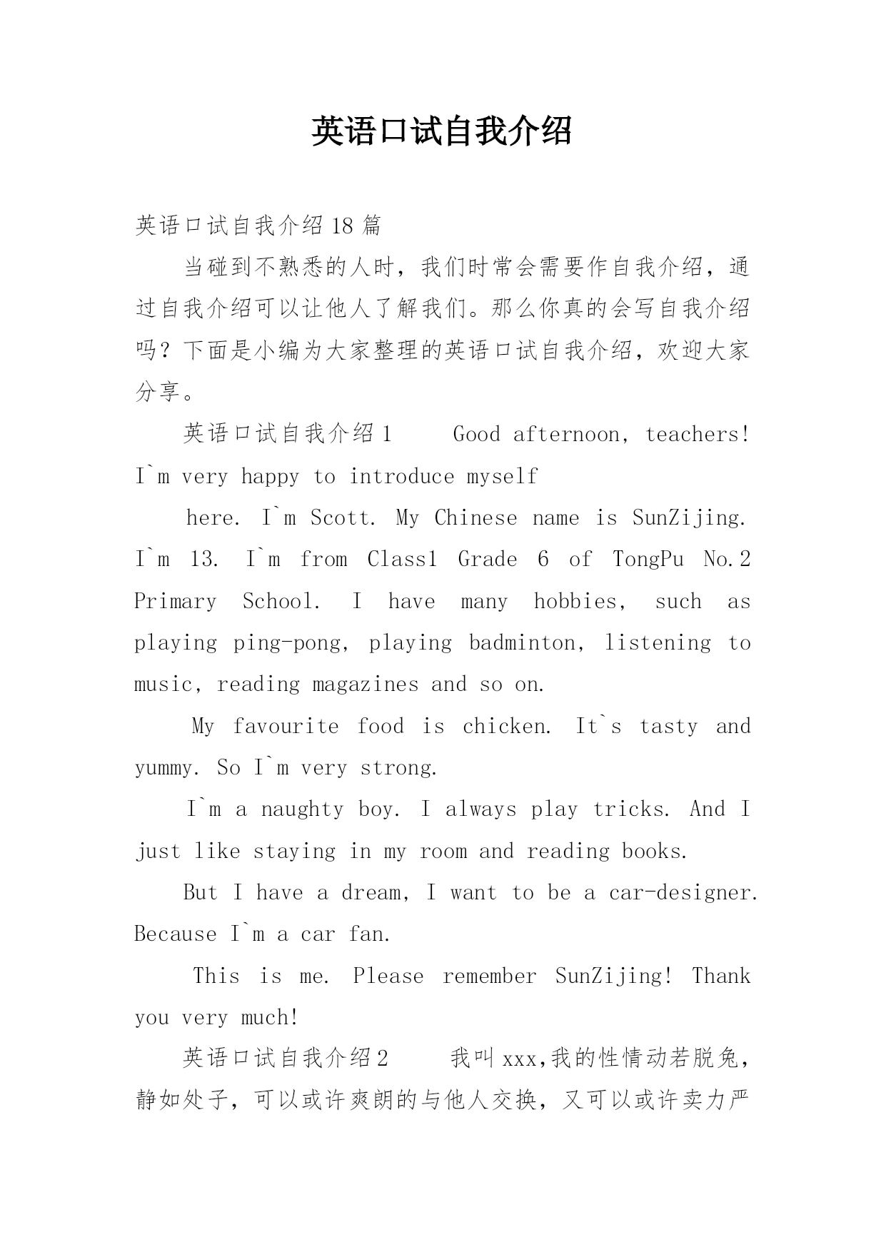 英语口试自我介绍英语口试自我介绍18篇当碰到不熟悉的人时,我们时常会需要作自我介绍,通过自我介绍可以让他人了解我们。那么你真的会写自我介绍吗?下面是小编为大家整理的英语口试自我介绍,欢迎大家分享。英语口试自我介绍1Goodafternoon,teachers!I`mveryhappytointroducemyselfhere.I`mScott.MyChinesenameisSunZijing.I`m13.I`mfromClass1Grade6ofTongPuNo.2PrimarySchool.Ihavem