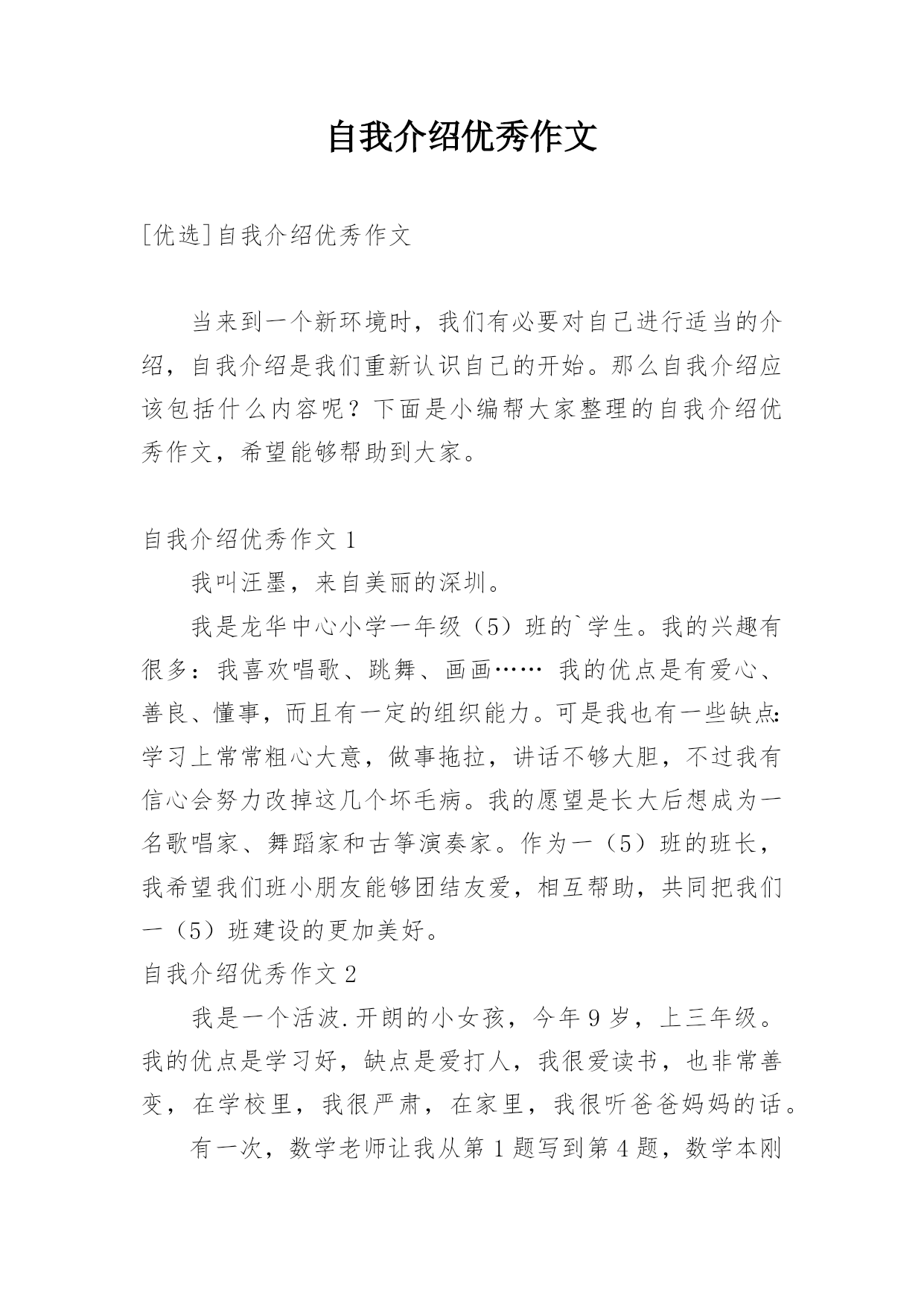 自我介绍优秀作文[优选]自我介绍优秀作文当来到一个新环境时,我们有必要对自己进行适当的介绍,自我介绍是我们重新认识自己的开始。那么自我介绍应该包括什么内容呢?下面是小编帮大家整理的自我介绍优秀作文,希望能够帮助到大家。自我介绍优秀作文1我叫汪墨,来自美丽的深圳。我是龙华中心小学一年级(5)班的`学生。我的兴趣有很多:我喜欢唱歌、跳舞、画画……我的优点是有爱心、善良、懂事,而且有一定的组织能力。可是我也有一些缺点:学习上常常粗心大意,做事拖拉,讲话不够大胆,不过我有信心会努力改掉这几个坏毛病。我的愿望是长大