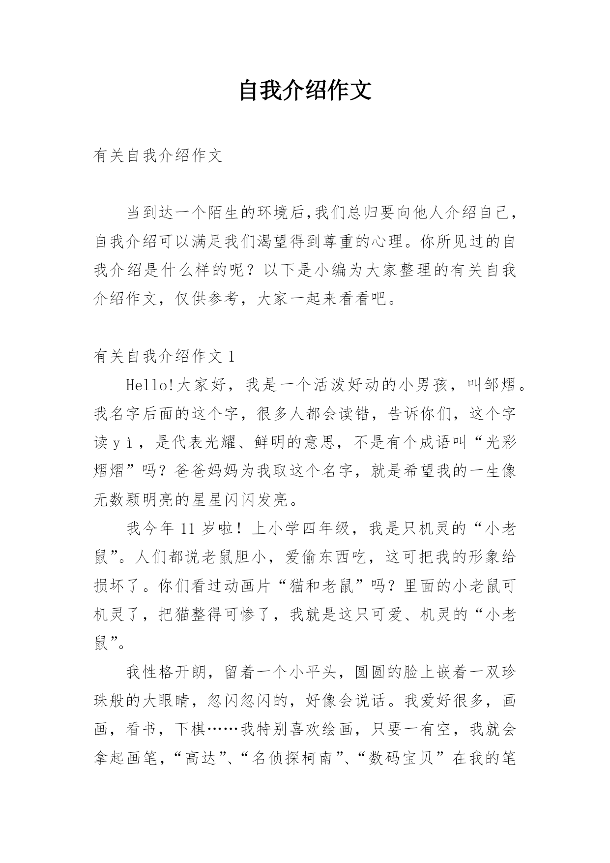 自我介绍作文有关自我介绍作文当到达一个陌生的环境后,我们总归要向他人介绍自己,自我介绍可以满足我们渴望得到尊重的心理。你所见过的自我介绍是什么样的呢?以下是小编为大家整理的有关自我介绍作文,仅供参考,大家一起来看看吧。有关自我介绍作文1Hello!大家好,我是一个活泼好动的小男孩,叫邹熠。我名字后面的这个字,很多人都会读错,告诉你们,这个字读yì,是代表光耀、鲜明的意思,不是有个成语叫“光彩熠熠”吗?爸爸妈妈为我取这个名字,就是希望我的一生像无数颗明亮的星星闪闪发亮。我今年11岁啦!上小学四年级,我是只机