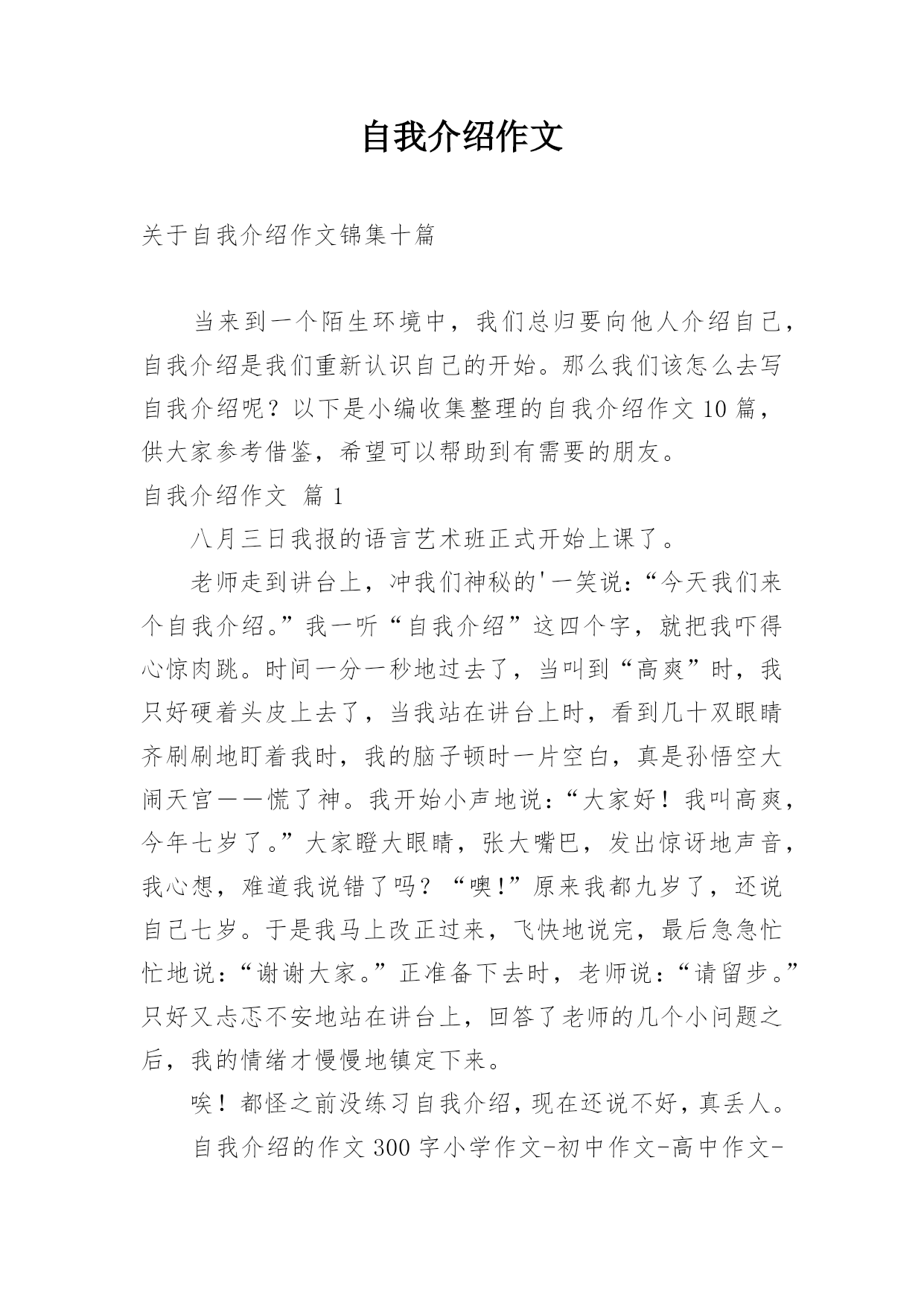 自我介绍作文关于自我介绍作文锦集十篇当来到一个陌生环境中,我们总归要向他人介绍自己,自我介绍是我们重新认识自己的开始。那么我们该怎么去写自我介绍呢?以下是小编收集整理的自我介绍作文10篇,供大家参考借鉴,希望可以帮助到有需要的朋友。自我介绍作文篇1八月三日我报的语言艺术班正式开始上课了。老师走到讲台上,冲我们神秘的'一笑说:“今天我们来个自我介绍。”我一听“自我介绍”这四个字,就把我吓得心惊肉跳。时间一分一秒地过去了,当叫到“高爽”时,我只好硬着头皮上去了,当我站在讲台上时,看到几十双眼睛齐刷刷地盯着我时