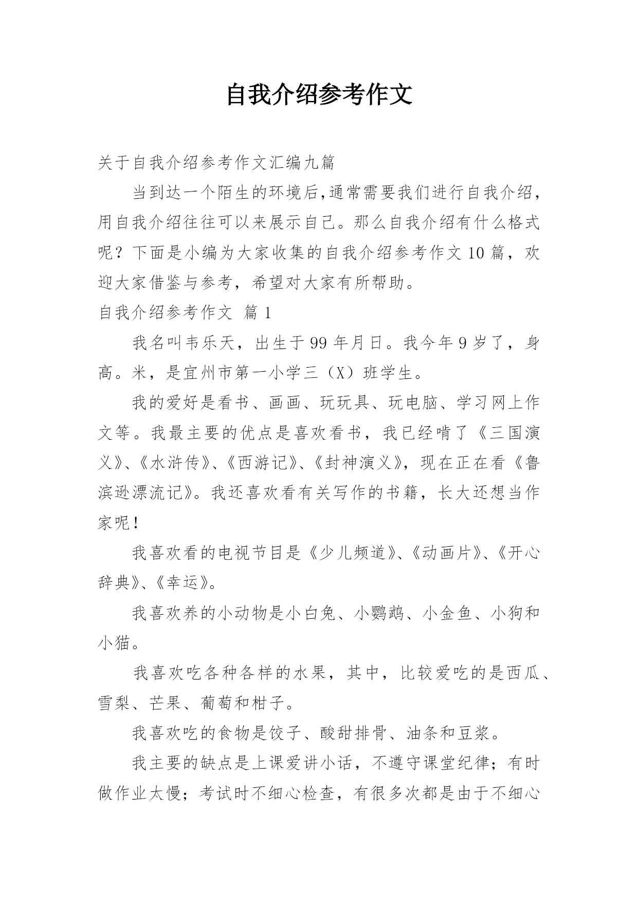 自我介绍参考作文关于自我介绍参考作文汇编九篇当到达一个陌生的环境后,通常需要我们进行自我介绍,用自我介绍往往可以来展示自己。那么自我介绍有什么格式呢?下面是小编为大家收集的自我介绍参考作文10篇,欢迎大家借鉴与参考,希望对大家有所帮助。自我介绍参考作文篇1我名叫韦乐天,出生于99年月日。我今年9岁了,身高。米,是宜州市第一小学三(X)班学生。我的爱好是看书、画画、玩玩具、玩电脑、学习网上作文等。我最主要的优点是喜欢看书,我已经啃了《三国演义》、《水浒传》、《西游记》、《封神演义》,现在正在看《鲁滨逊漂流记