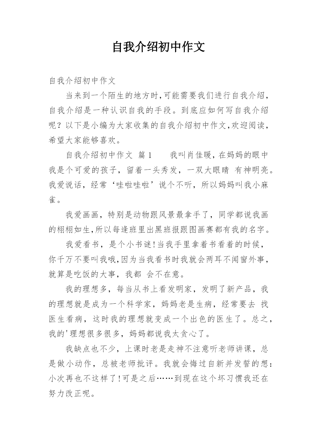 自我介绍初中作文自我介绍初中作文当来到一个陌生的地方时,可能需要我们进行自我介绍,自我介绍是一种认识自我的手段。到底应如何写自我介绍呢?以下是小编为大家收集的自我介绍初中作文,欢迎阅读,希望大家能够喜欢。自我介绍初中作文篇1我叫肖佳暖,在妈妈的眼中我是个可爱的孩子,留着一头秀发,一双大眼睛有神明亮。我爱说话,经常‘哇啦哇啦’说个不听,所以妈妈叫我小麻雀。我爱画画,特别是动物跟风景最拿手了,同学都说我画的栩栩如生,所以每逢班里出黑班报跟图画赛都有我的名字。我爱看书,是个小书谜!当我手里拿着书看着的时候,你千