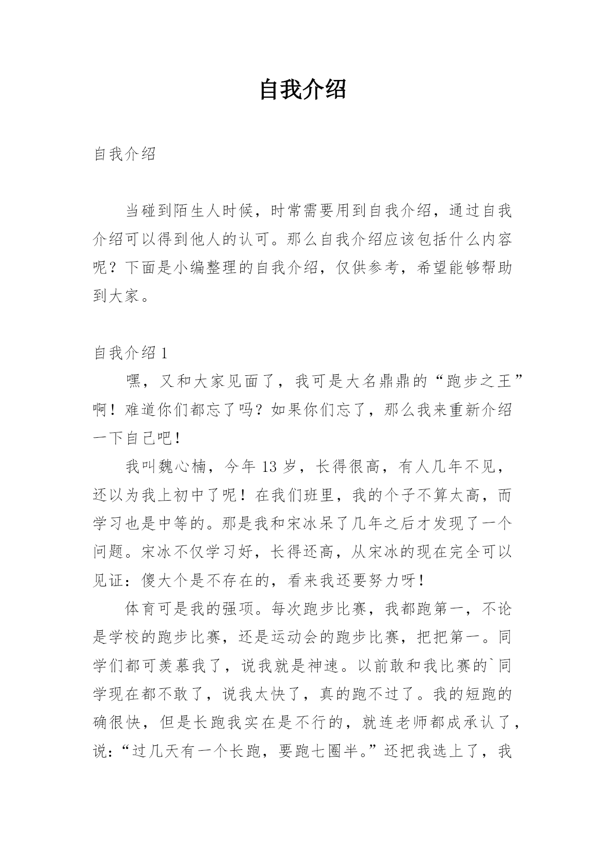 自我介绍自我介绍当碰到陌生人时候,时常需要用到自我介绍,通过自我介绍可以得到他人的认可。那么自我介绍应该包括什么内容呢?下面是小编整理的自我介绍,仅供参考,希望能够帮助到大家。自我介绍1嘿,又和大家见面了,我可是大名鼎鼎的“跑步之王”啊!难道你们都忘了吗?如果你们忘了,那么我来重新介绍一下自己吧!我叫魏心楠,今年13岁,长得很高,有人几年不见,还以为我上初中了呢!在我们班里,我的个子不算太高,而学习也是中等的。那是我和宋冰呆了几年之后才发现了一个问题。宋冰不仅学习好,长得还高,从宋冰的现在完全可以见证:傻