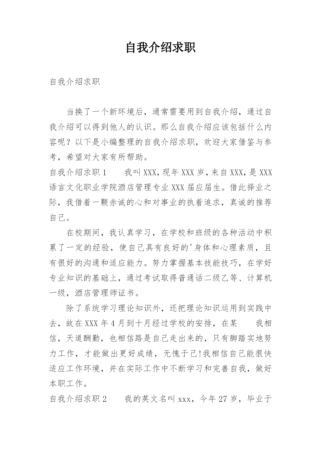 自我介绍求职自我介绍求职当换了一个新环境后,通常需要用到自我介绍,通过自我介绍可以得到他人的认识。那么自我介绍应该包括什么内容呢?以下是小编整理的自我介绍求职,欢迎大家借鉴与参考,希望对大家有所帮助。自我介绍求职1我叫XXX,现年XXX岁,来自XXX,是XXX语言文化职业学院酒店管理专业XXX届应届生。借此择业之际,我借着一颗赤诚的心和对事业的执着追求,真诚的推荐自己。在校期间,我认真学习,在学校和班级的各种活动中积累了一定的经验,使自己具有良好的'身体和心理素质,且有很好的沟通和适应能力。努力掌握基本技