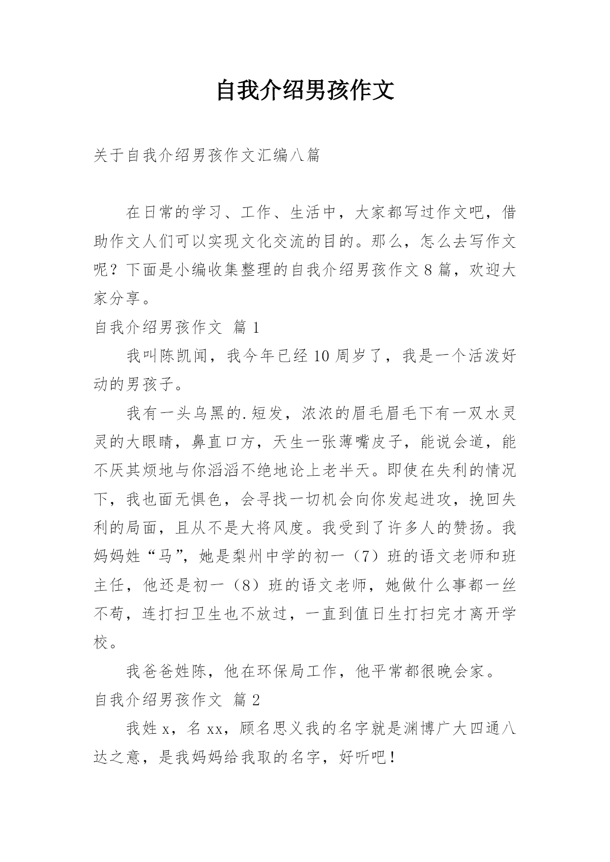 自我介绍男孩作文关于自我介绍男孩作文汇编八篇在日常的学习、工作、生活中,大家都写过作文吧,借助作文人们可以实现文化交流的目的。那么,怎么去写作文呢?下面是小编收集整理的自我介绍男孩作文8篇,欢迎大家分享。自我介绍男孩作文篇1我叫陈凯闻,我今年已经10周岁了,我是一个活泼好动的男孩子。我有一头乌黑的.短发,浓浓的眉毛眉毛下有一双水灵灵的大眼睛,鼻直口方,天生一张薄嘴皮子,能说会道,能不厌其烦地与你滔滔不绝地论上老半天。即使在失利的情况下,我也面无惧色,会寻找一切机会向你发起进攻,挽回失利的局面,且从不是大将