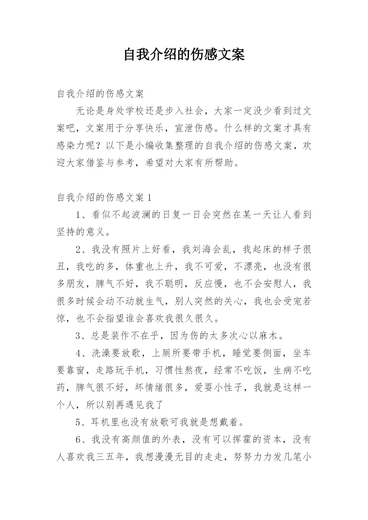 自我介绍的伤感文案自我介绍的伤感文案无论是身处学校还是步入社会,大家一定没少看到过文案吧,文案用于分享快乐,宣泄伤感。什么样的文案才具有感染力呢?以下是小编收集整理的自我介绍的伤感文案,欢迎大家借鉴与参考,希望对大家有所帮助。自我介绍的伤感文案11、看似不起波澜的日复一日会突然在某一天让人看到坚持的意义。2、我没有照片上好看,我刘海会乱,我起床的样子很丑,我吃的多,体重也上升,我不可爱,不漂亮,也没有很多朋友,脾气不好,我不聪明,反应慢,也不会安慰人,我很多时候会动不动就生气,别人突然的关心,我也会受宠若