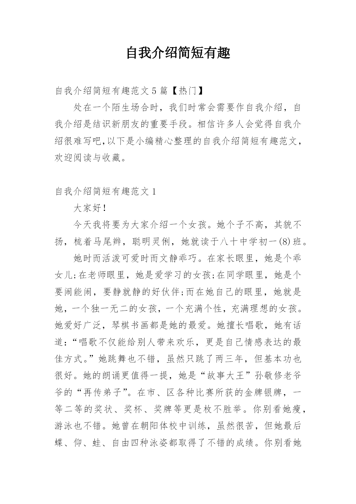 自我介绍简短有趣自我介绍简短有趣范文5篇【热门】处在一个陌生场合时,我们时常会需要作自我介绍,自我介绍是结识新朋友的重要手段。相信许多人会觉得自我介绍很难写吧,以下是小编精心整理的自我介绍简短有趣范文,欢迎阅读与收藏。自我介绍简短有趣范文1大家好!今天我将要为大家介绍一个女孩。她个子不高,其貌不扬,梳着马尾辫,聪明灵俐,她就读于八十中学初一(8)班。她时而活泼可爱时而文静乖巧。在家长眼里,她是个乖女儿;在老师眼里,她是爱学习的女孩;在同学眼里,她是个要闹能闹,要静就静的好伙伴;而在她自己的眼里,她就是她,