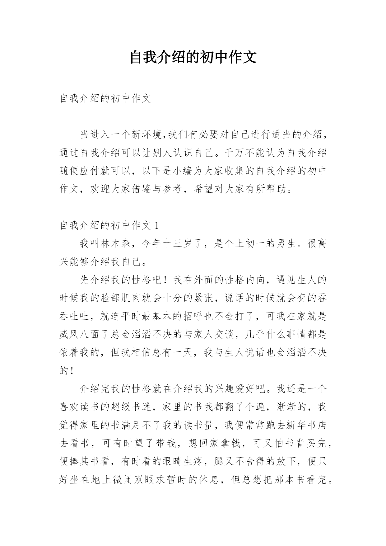 自我介绍的初中作文自我介绍的初中作文当进入一个新环境,我们有必要对自己进行适当的介绍,通过自我介绍可以让别人认识自己。千万不能认为自我介绍随便应付就可以,以下是小编为大家收集的自我介绍的初中作文,欢迎大家借鉴与参考,希望对大家有所帮助。自我介绍的初中作文1我叫林木森,今年十三岁了,是个上初一的男生。很高兴能够介绍我自己。先介绍我的性格吧!我在外面的性格内向,遇见生人的时候我的脸部肌肉就会十分的紧张,说话的时候就会变的吞吞吐吐,就连平时最基本的招呼也不会打了,可我在家就是威风八面了总会滔滔不决的与家人交谈,