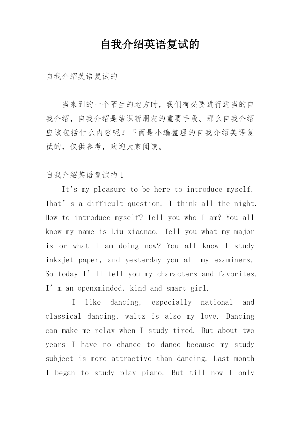 自我介绍英语复试的自我介绍英语复试的当来到的一个陌生的地方时,我们有必要进行适当的自我介绍,自我介绍是结识新朋友的重要手段。那么自我介绍应该包括什么内容呢?下面是小编整理的自我介绍英语复试的,仅供参考,欢迎大家阅读。自我介绍英语复试的1It’smypleasuretobeheretointroducemyself.That’sadifficultquestion.Ithinkallthenight.Howtointroducemyself?TellyouwhoIam?YouallknowmynameisL