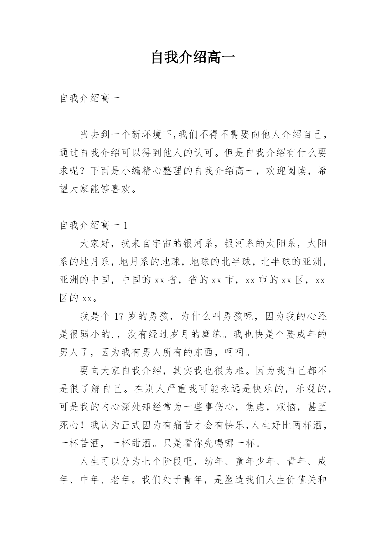 自我介绍高一自我介绍高一当去到一个新环境下,我们不得不需要向他人介绍自己,通过自我介绍可以得到他人的认可。但是自我介绍有什么要求呢?下面是小编精心整理的自我介绍高一,欢迎阅读,希望大家能够喜欢。自我介绍高一1大家好,我来自宇宙的银河系,银河系的太阳系,太阳系的地月系,地月系的地球,地球的北半球,北半球的亚洲,亚洲的中国,中国的xx省,省的xx市,xx市的xx区,xx区的xx。我是个17岁的男孩,为什么叫男孩呢,因为我的心还是很弱小的.,没有经过岁月的磨练。我也快是个要成年的男人了,因为我有男人所有的东西,