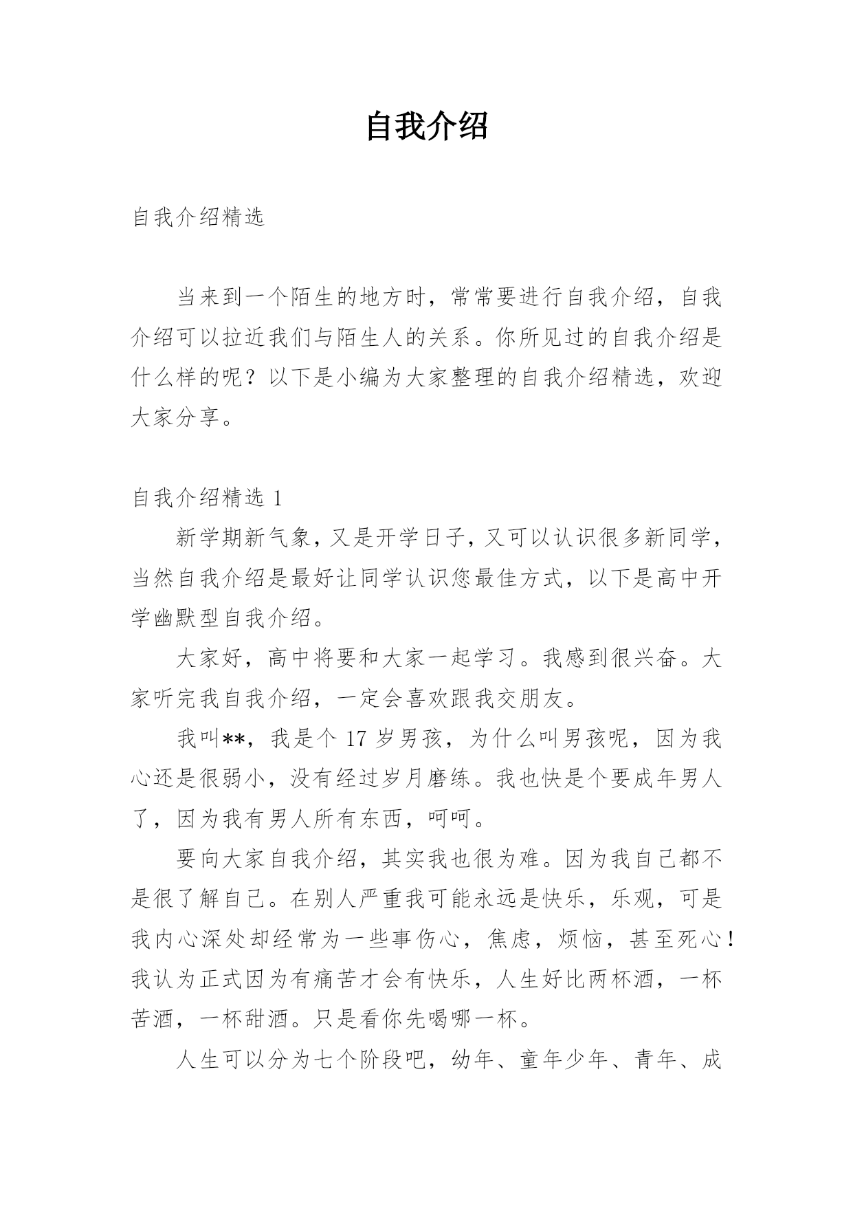 自我介绍自我介绍精选当来到一个陌生的地方时,常常要进行自我介绍,自我介绍可以拉近我们与陌生人的关系。你所见过的自我介绍是什么样的呢?以下是小编为大家整理的自我介绍精选,欢迎大家分享。自我介绍精选1新学期新气象,又是开学日子,又可以认识很多新同学,当然自我介绍是最好让同学认识您最佳方式,以下是高中开学幽默型自我介绍。大家好,高中将要和大家一起学习。我感到很兴奋。大家听完我自我介绍,一定会喜欢跟我交朋友。我叫**,我是个17岁男孩,为什么叫男孩呢,因为我心还是很弱小,没有经过岁月磨练。我也快是个要成年男人了,