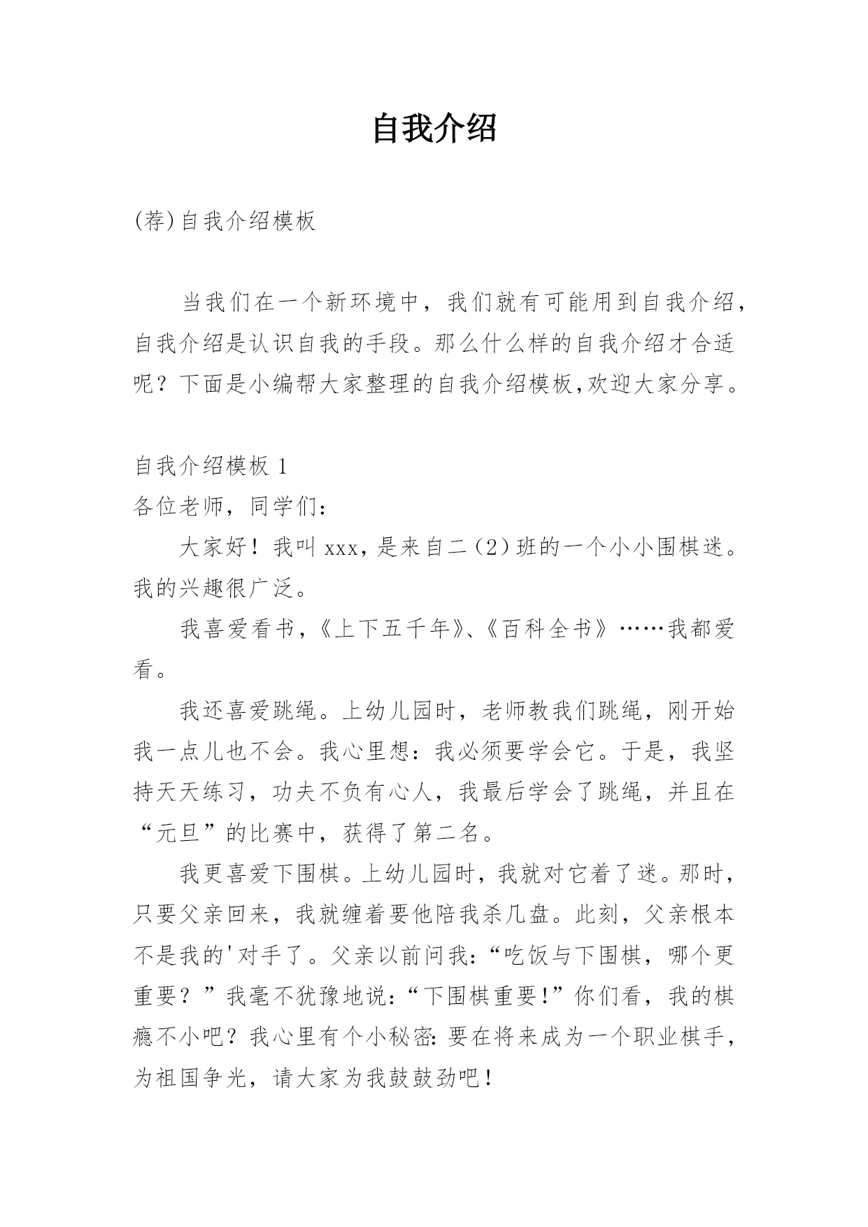 自我介绍(荐)自我介绍模板当我们在一个新环境中,我们就有可能用到自我介绍,自我介绍是认识自我的手段。那么什么样的自我介绍才合适呢?下面是小编帮大家整理的自我介绍模板,欢迎大家分享。自我介绍模板1各位老师,同学们:大家好!我叫xxx,是来自二(2)班的一个小小围棋迷。我的兴趣很广泛。我喜爱看书,《上下五千年》、《百科全书》……我都爱看。我还喜爱跳绳。上幼儿园时,老师教我们跳绳,刚开始我一点儿也不会。我心里想:我必须要学会它。于是,我坚持天天练习,功夫不负有心人,我最后学会了跳绳,并且在“元旦”的比赛中,获得