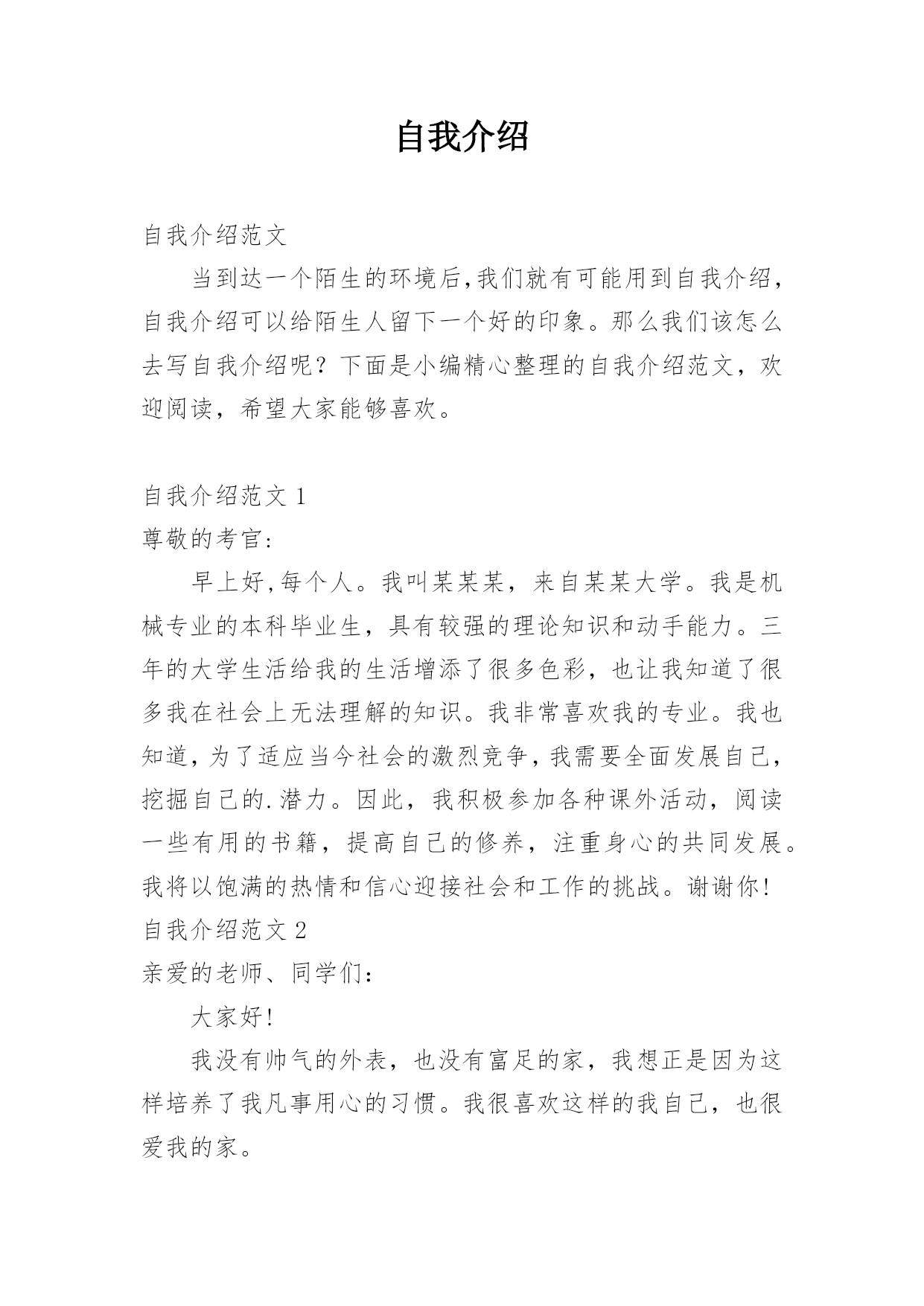 自我介绍自我介绍范文当到达一个陌生的环境后,我们就有可能用到自我介绍,自我介绍可以给陌生人留下一个好的印象。那么我们该怎么去写自我介绍呢?下面是小编精心整理的自我介绍范文,欢迎阅读,希望大家能够喜欢。自我介绍范文1尊敬的考官:早上好,每个人。我叫某某某,来自某某大学。我是机械专业的本科毕业生,具有较强的理论知识和动手能力。三年的大学生活给我的生活增添了很多色彩,也让我知道了很多我在社会上无法理解的知识。我非常喜欢我的专业。我也知道,为了适应当今社会的激烈竞争,我需要全面发展自己,挖掘自己的.潜力。因此,我