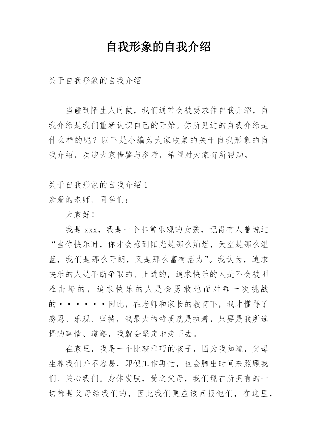自我形象的自我介绍关于自我形象的自我介绍当碰到陌生人时候,我们通常会被要求作自我介绍,自我介绍是我们重新认识自己的开始。你所见过的自我介绍是什么样的呢?以下是小编为大家收集的关于自我形象的自我介绍,欢迎大家借鉴与参考,希望对大家有所帮助。关于自我形象的自我介绍1亲爱的老师、同学们:大家好!我是xxx,我是一个非常乐观的女孩,记得有人曾说过“当你快乐时,你才会感到阳光是那么灿烂,天空是那么湛蓝,我们是那么开朗,又是那么富有活力”。我认为,追求快乐的人是不断争取的、上进的,追求快乐的人是不会被困难击垮的,追求