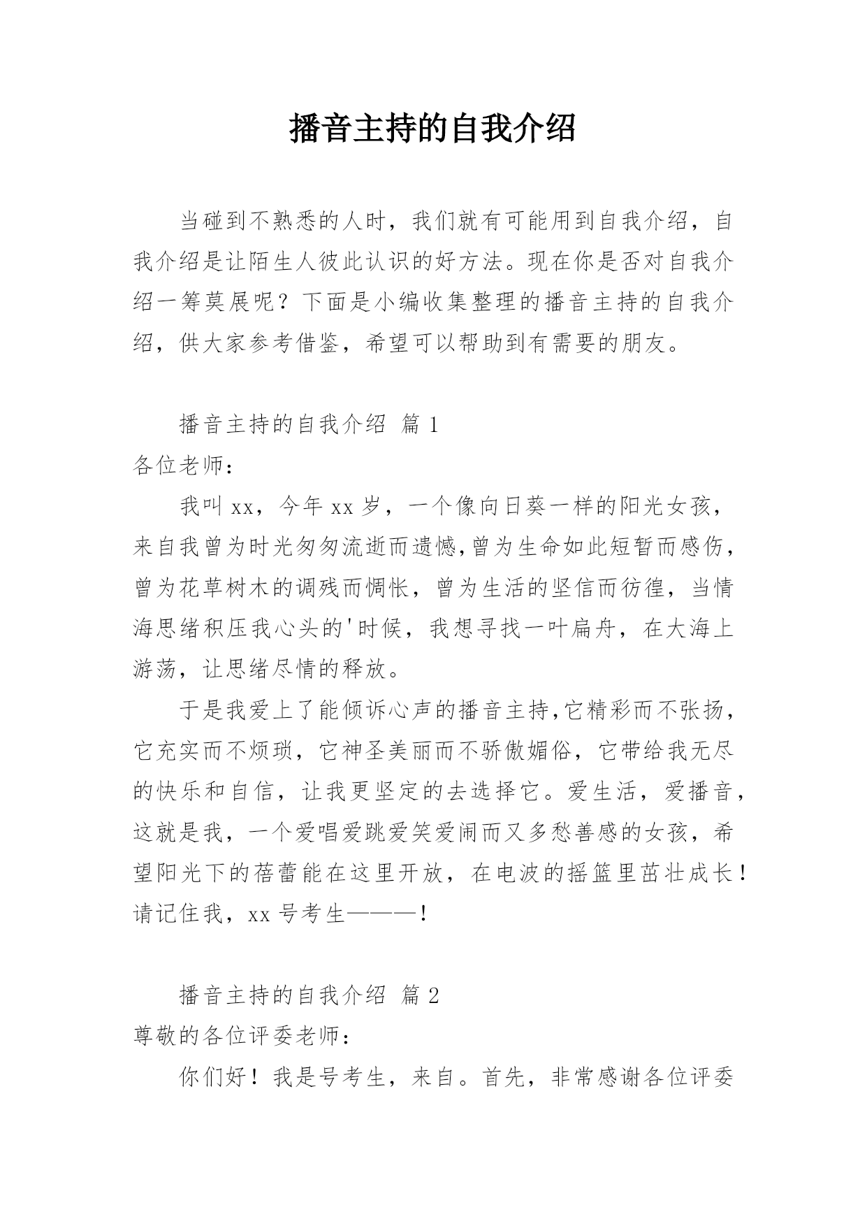 播音主持的自我介绍当碰到不熟悉的人时,我们就有可能用到自我介绍,自我介绍是让陌生人彼此认识的好方法。现在你是否对自我介绍一筹莫展呢?下面是小编收集整理的播音主持的自我介绍,供大家参考借鉴,希望可以帮助到有需要的朋友。播音主持的自我介绍篇1各位老师:我叫xx,今年xx岁,一个像向日葵一样的阳光女孩,来自我曾为时光匆匆流逝而遗憾,曾为生命如此短暂而感伤,曾为花草树木的调残而惆怅,曾为生活的坚信而彷徨,当情海思绪积压我心头的'时候,我想寻找一叶扁舟,在大海上游荡,让思绪尽情的释放。于是我爱上了能倾诉心声的播音主