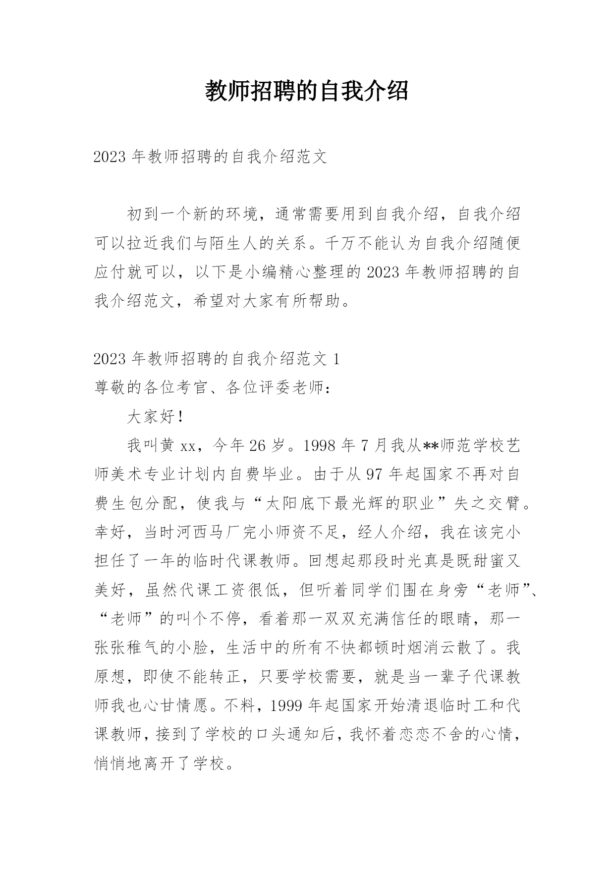 教师招聘的自我介绍2023年教师招聘的自我介绍范文初到一个新的环境,通常需要用到自我介绍,自我介绍可以拉近我们与陌生人的关系。千万不能认为自我介绍随便应付就可以,以下是小编精心整理的2023年教师招聘的自我介绍范文,希望对大家有所帮助。2023年教师招聘的自我介绍范文1尊敬的各位考官、各位评委老师:大家好!我叫黄xx,今年26岁。1998年7月我从**师范学校艺师美术专业计划内自费毕业。由于从97年起国家不再对自费生包分配,使我与“太阳底下最光辉的职业”失之交臂。幸好,当时河西马厂完小师资不足,经人介绍,
