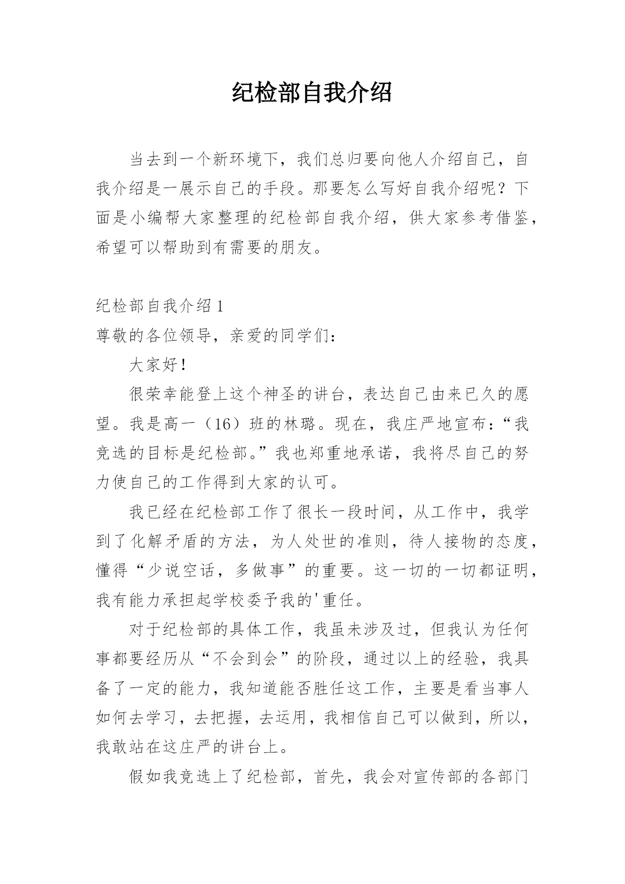 纪检部自我介绍当去到一个新环境下,我们总归要向他人介绍自己,自我介绍是一展示自己的手段。那要怎么写好自我介绍呢?下面是小编帮大家整理的纪检部自我介绍,供大家参考借鉴,希望可以帮助到有需要的朋友。纪检部自我介绍1尊敬的各位领导,亲爱的同学们:大家好!很荣幸能登上这个神圣的讲台,表达自己由来已久的愿望。我是高一(16)班的林璐。现在,我庄严地宣布:“我竞选的目标是纪检部。”我也郑重地承诺,我将尽自己的努力使自己的工作得到大家的认可。我已经在纪检部工作了很长一段时间,从工作中,我学到了化解矛盾的方法,为人处世的