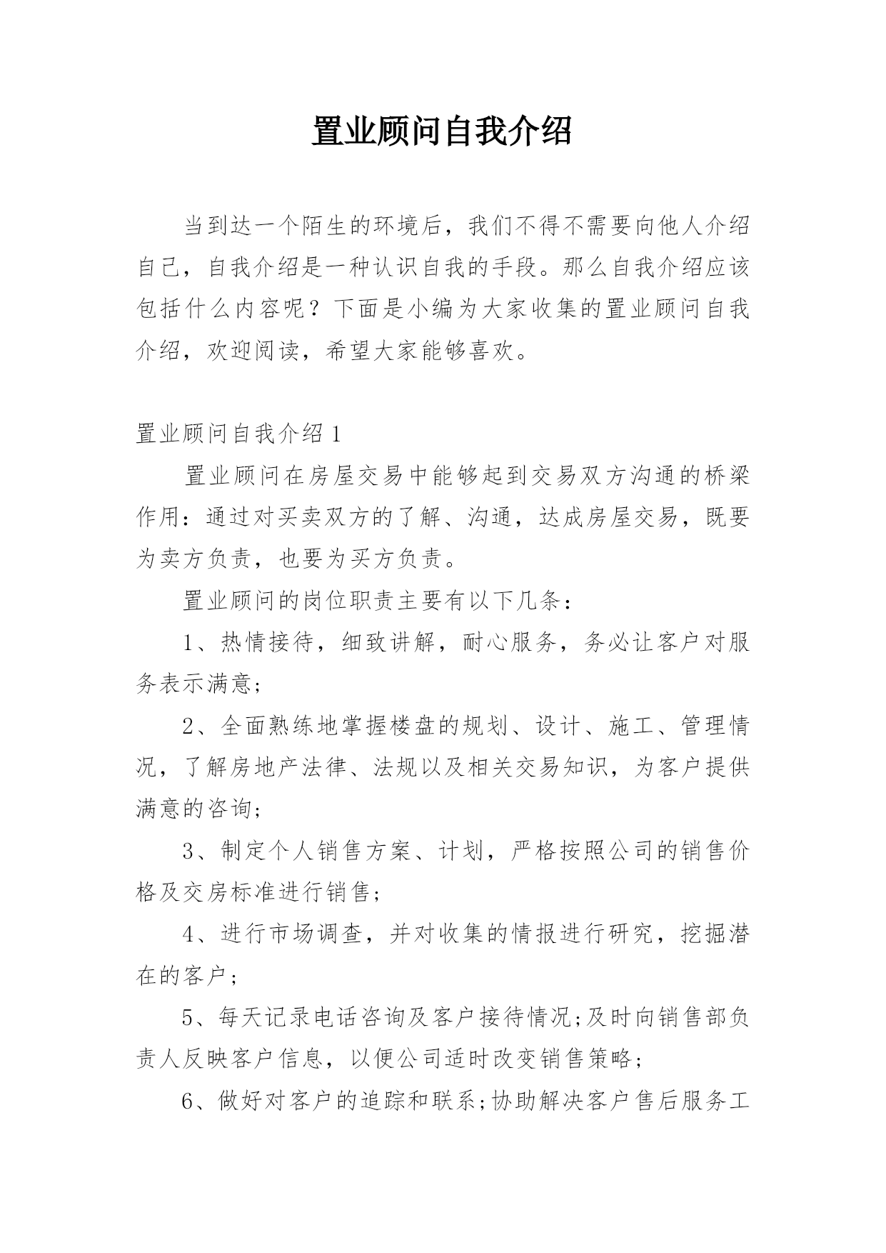 置业顾问自我介绍当到达一个陌生的环境后,我们不得不需要向他人介绍自己,自我介绍是一种认识自我的手段。那么自我介绍应该包括什么内容呢?下面是小编为大家收集的置业顾问自我介绍,欢迎阅读,希望大家能够喜欢。置业顾问自我介绍1置业顾问在房屋交易中能够起到交易双方沟通的桥梁作用:通过对买卖双方的了解、沟通,达成房屋交易,既要为卖方负责,也要为买方负责。置业顾问的岗位职责主要有以下几条:1、热情接待,细致讲解,耐心服务,务必让客户对服务表示满意;2、全面熟练地掌握楼盘的规划、设计、施工、管理情况,了解房地产法律、法规